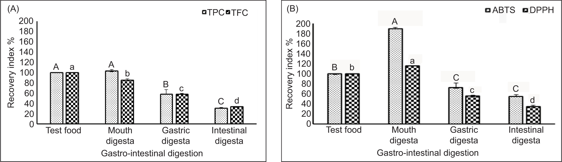 Figure 1. Recovery index (A and B) of TPC, TFC, ABTS, and DPPH after simulated gastro-intestinal digestion (mouth, stomach, and intestinal phases) of olive pomace.