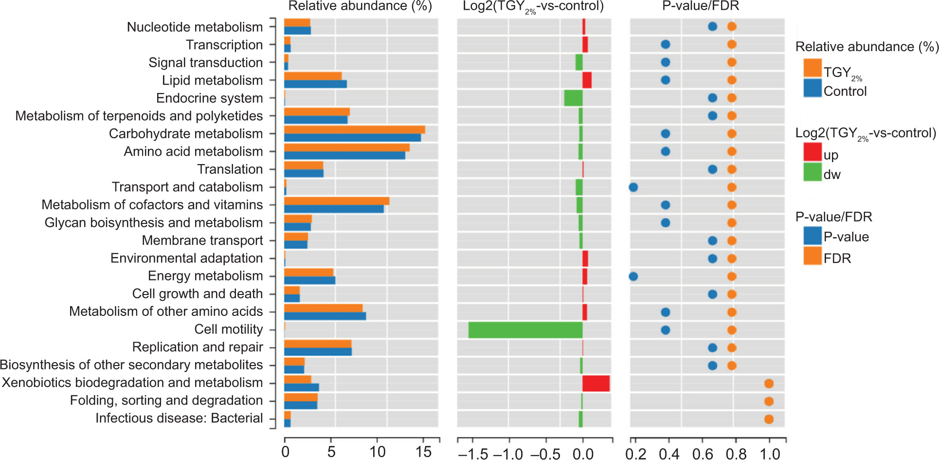 The addition of 2% C. cathayensis Sarg. promotes terpenoids and polyketides metabolism, amino acid metabolism, membrane transport, replication and repair, signal transduction, and translation (Figure 3). The metabolic abundance of glycan biosynthesis and metabolism, nucleotide metabolism, endocrine system, and xenobiotic biodegradation and metabolism were significantly (P<0.05) upregulated, indicating upregulation of the metabolic abundance of L. delbrueckii subsp., L. lactis, L. crispatus, L. fermentum, L. lactis, L. cepaci, and L. cepa. crispatus. L. fermentum and B. claussenii were slightly more abundant than the other two groups control and TGY2%.