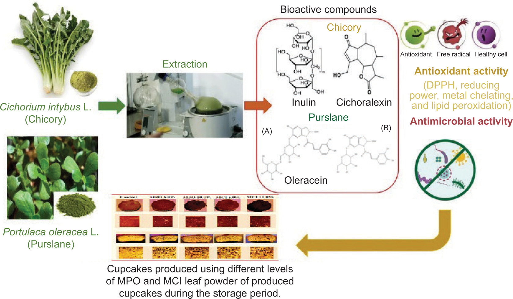 The current pharmacological studies have shown that P. oleracea has several bioactive properties, such as antibacterial and antioxidant properties (Kumar, et al., 2022). P. oleracea extracts have hepatoprotective, neuroprotective, and antimicrobial properties (Chugh et al., 2019). Cakes, being a popular snack, serve as an effective vehicle for delivering phenolic antioxidants and functional plant-based compounds. High concentrations of bioactive chemicals in edible plants enhance the overall quality of various food products, including processed wheat items, by minimizing chemical reactions and inhibiting microbial growth (Admassu and Kebede, 2019b; Javanmardi et al., 2019; Li et al., 2014). Despite the potential benefits, there is a notable lack of scientific literature regarding the bioactive compounds in C. intybus and P. oleracea. Therefore, this study aims to evaluate the antioxidant activities of graded amounts of chicory (C. intybus L.) and purslane (P. oleracea L.) powder in cupcakes, focusing on their effects on the products’ appearance, texture, flavor, and the overall acceptability.