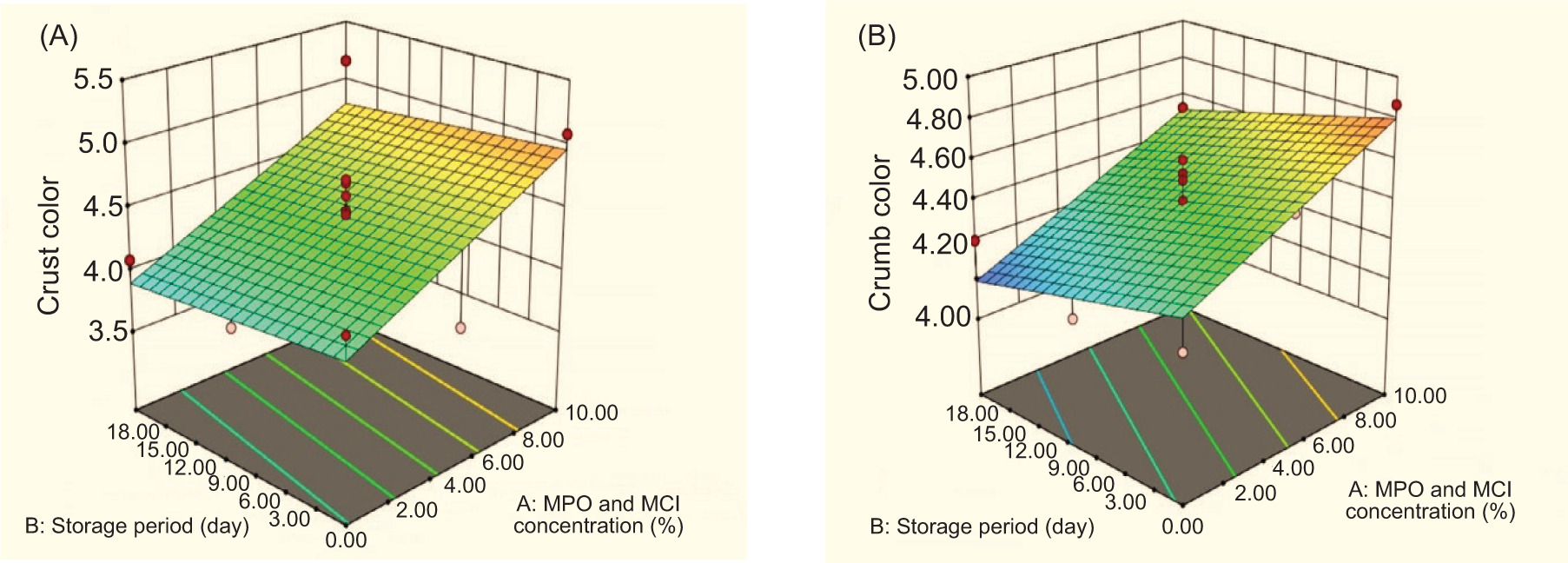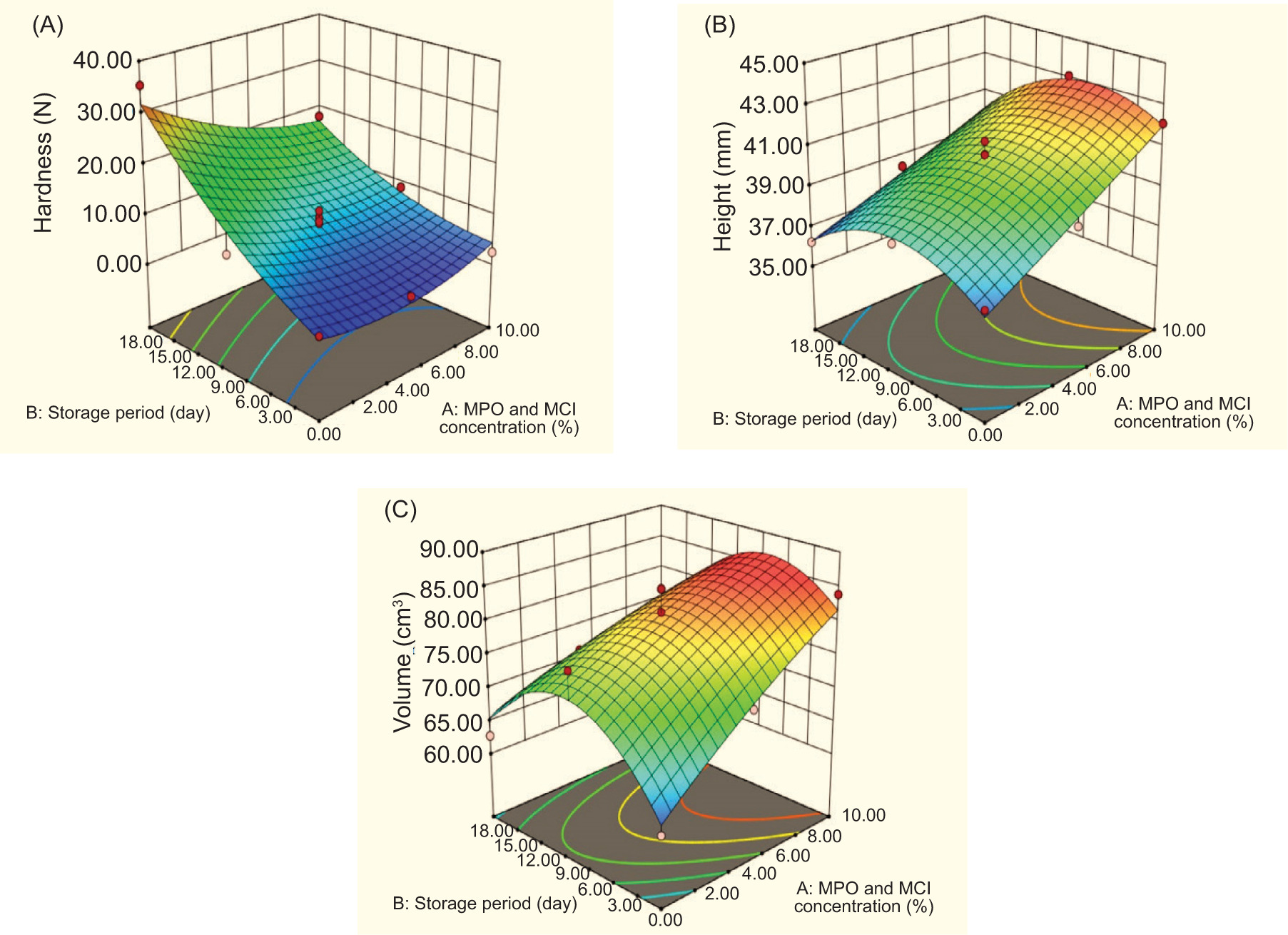 Suitable statistical techniques, such as the Bonferroni test and Tukey’s test, were used to assess the data. The production optimization of the MPO and MCI-enriched cakes was carried out by utilizing the Design-Expert software 11.1.2.0. The experiment was conducted thrice, and each time three measurements were reproduced. The effect was determined as statistically significant by using the least significant difference (p < 0.05) technique. A two-way analysis of variance was carried out for statistical comparisons involving different variables. The significance of group differences was assessed using Duncan’s analysis (p < 0.05). The central composite design (CCD) was employed for designing the experiments. MPO and MCI concentrations (X1) and storage time (X2) at three distinct coded levels—low (1), medium (0), and high (+1)—were examined as independent variables.