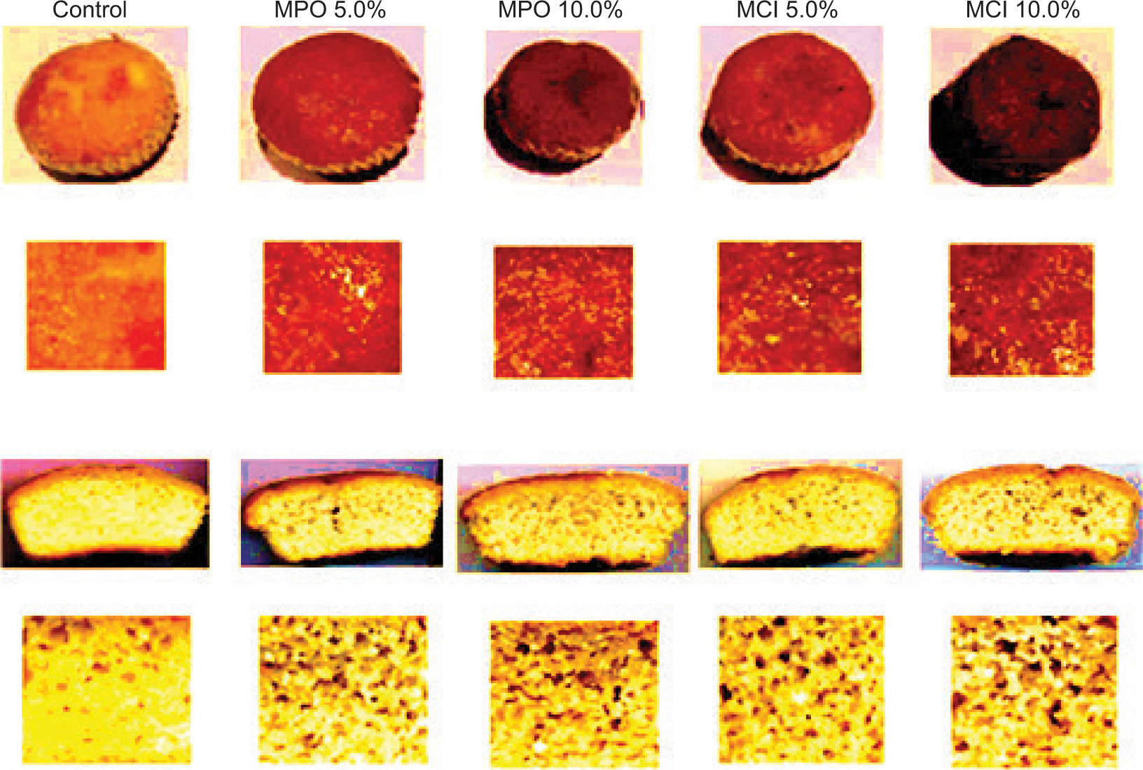 When chicory and purslane leaves powder were added to dough, the color of cupcake samples darkened (Table 2 and Figure 2). Owing to high concentrations of chlorophyll and other pigments, chicory and purslane leaves are dark green in color, which is the main cause of the dark color changes of cupcake. Bourekoua et al. (2018) reported similar outcomes. A lightening agent can be used to conceal the dark color, making the chicory and purslane leaves powder-containing cupcakes more acceptable. As consumers are more accustomed to cupcakes of a golden-brown hue color, the dark color may reduce their attractiveness; however, white cupcakes are more frequently consumed than brown cupcakes. The application of lightning agents was not examined in this study. Brown cupcakes with 5% MPO and MCI had nearly the same shade as the control, demonstrating that a concentration lower than 5% could provide a lighter cupcake with greater nutritional benefits.