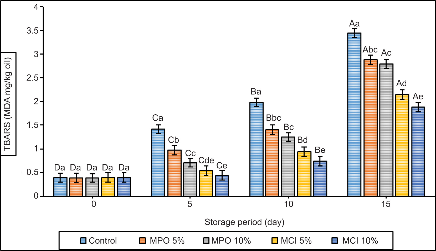 According to Peretti et al. (2006), the TBARS values (mg of malonaldehyde per kg of oil sample) of cupcake samples were calculated spectrophotometrically. In order to measure absorbance, a spectrophotometer was used at 530 nm (model UV-VIS-2802PC; USA).