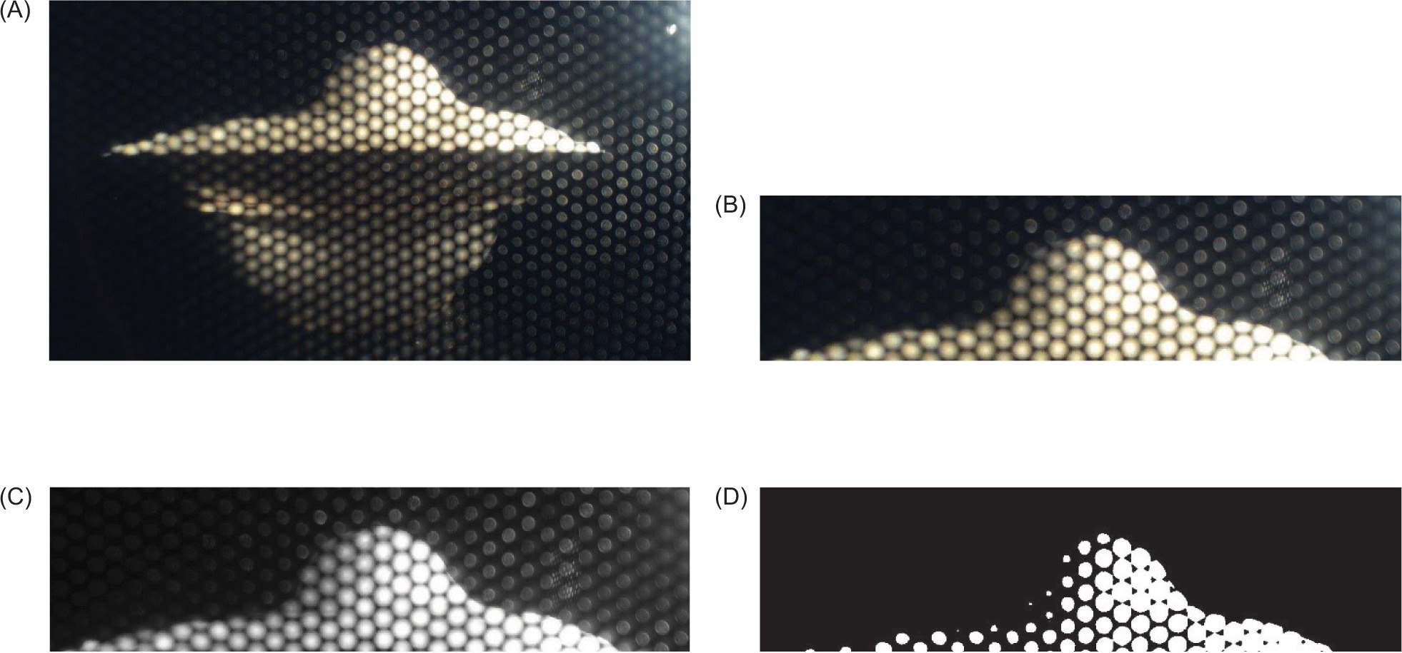 Figure 1. Image processing procedure for foam expansion analysis. (A) original image, (B) cropped image, (C) grayscale image, and (D) filtered and dilated image.