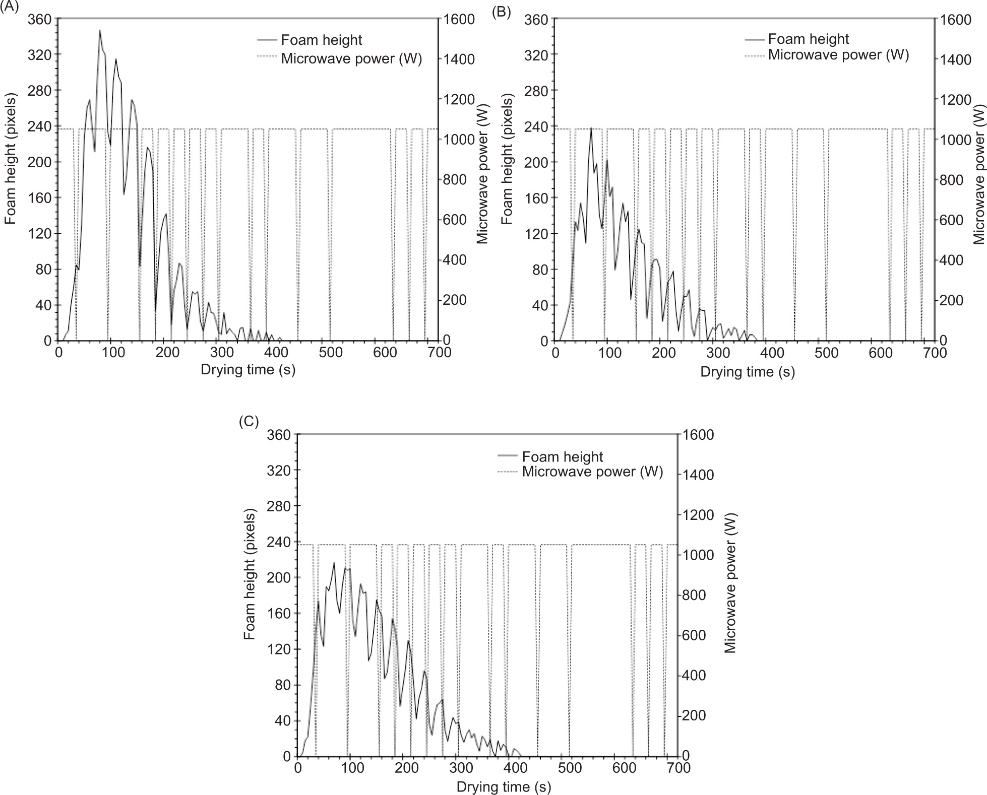 Figure 6. Foam height (pixel) as a function of drying time (s) at 500 W and (A) 50°C, (B) 60°C, and (C) 70°C.