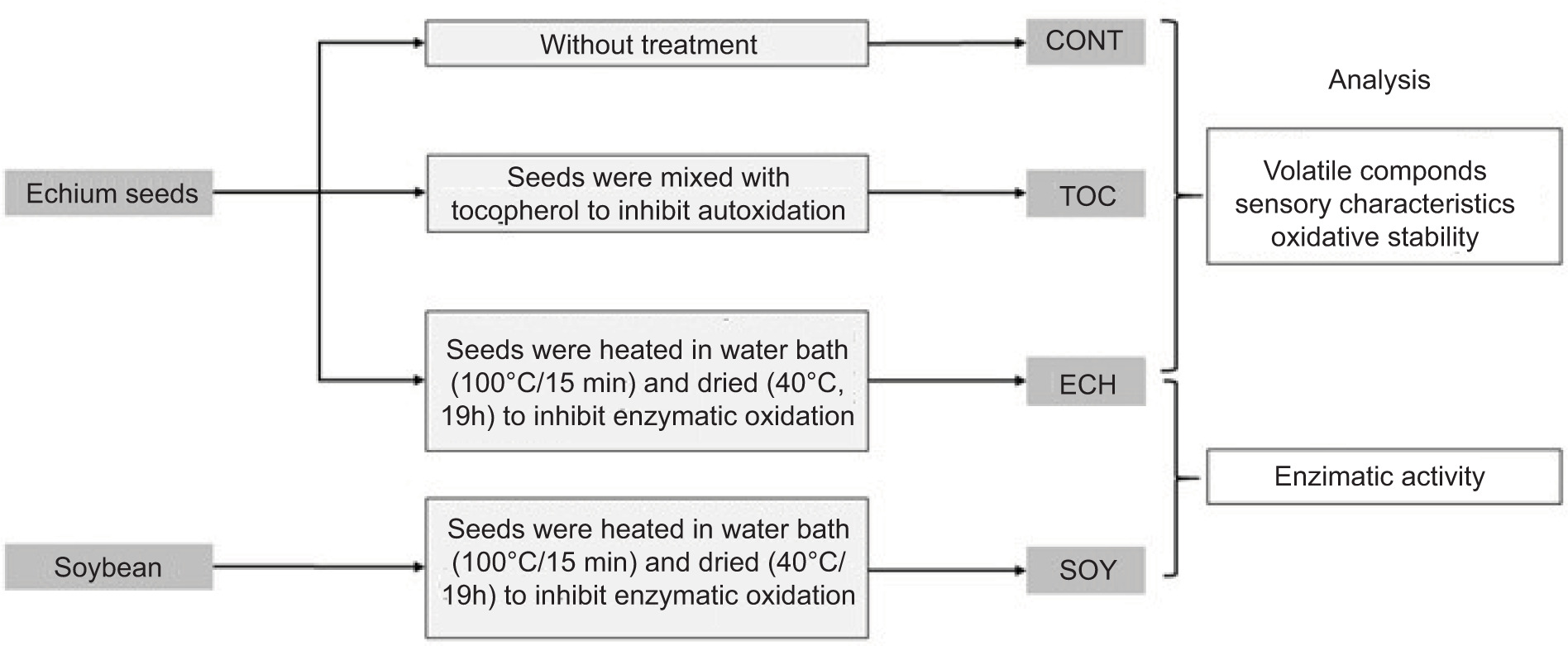 Understanding the oxidative mechanism is essential to define the best strategy to inhibit oxidation and obtain a palatable oil that is acceptable to consumers. Our group has evaluated different alternatives to improve the oxidative stability of crude and refined echium oil and their emulsions (Roschel et al., 2021; da Silveira et al., 2020; Comunian et al., 2019; Comunian et al., 2018; Espinosa et al., 2015). However, all these strategies have been applied to the oil rather than the seeds. It was hypothesized that the unpleasant odor of crude echium oil immediately after extraction from the seeds could be caused by volatile compounds formed from the enzymatic and/or nonenzymatic oxidation of PUFA. Thus, the objective of this study was to determine the LOX activity in recently crushed echium seeds and to evaluate the influence of LOX thermal inactivation and the addition of a mix of tocopherols in volatile compounds released during oil extraction.