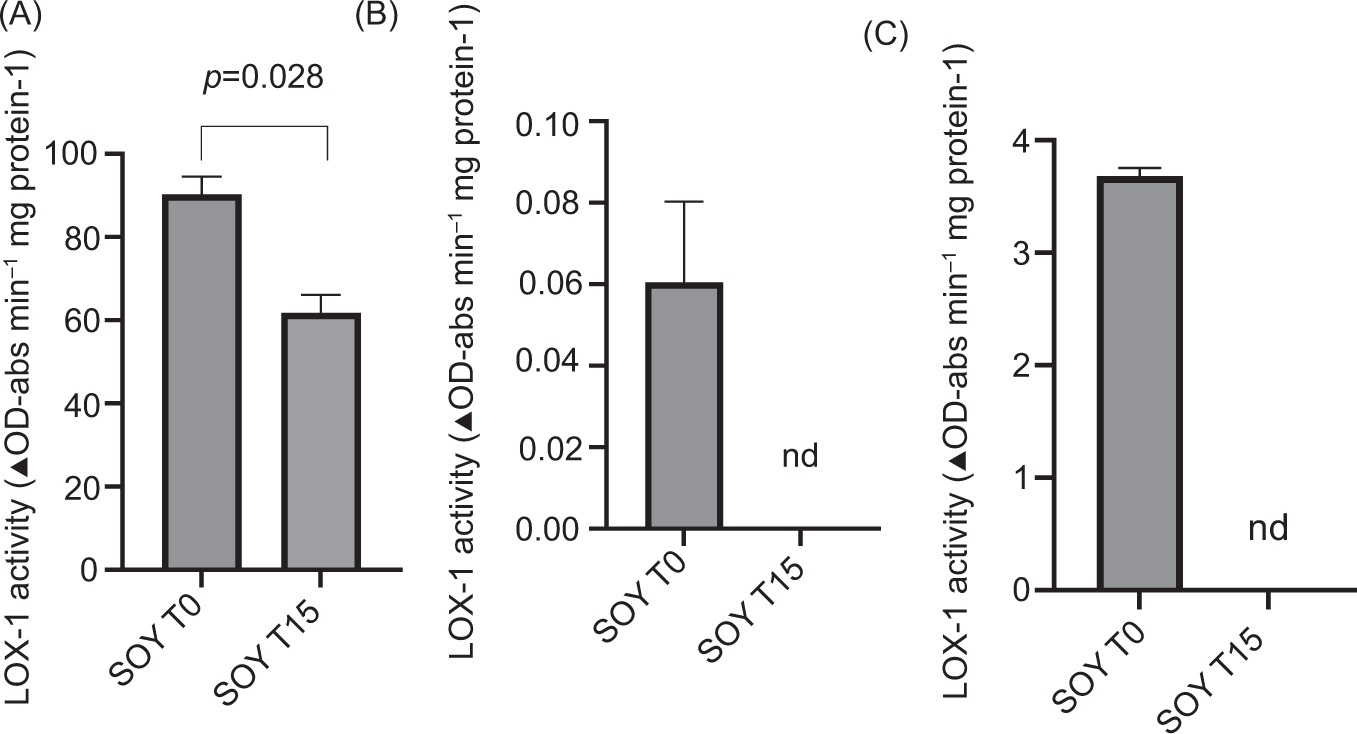 Figure 2. LOX activity determined in the soybeans before (T0) and after (T15) the thermal treatment (100°C/15 min). (A) LOX-1 activity (pH=9.0; λ=234 nm); (B) LOX-2 activity (pH=6.1; λ=238 nm); and (C) LOX-3 activity (pH=6.5; λ=280 nm). Bars represent mean ± SD (n=3). Abbreviations: crude soybean seeds (SOY T0) and soybean seeds after thermal treatment (SOY T15).