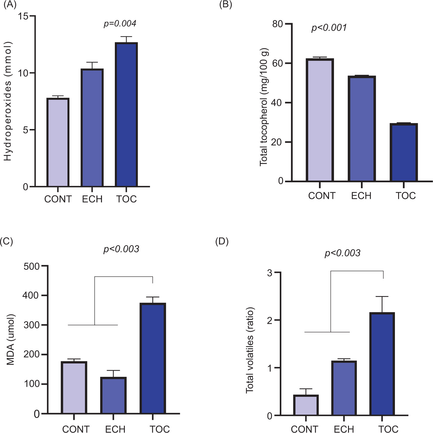 Figure 3. Oxidative stability of the echium oil extracted from the seeds. (A) Hydroperoxides; (B) total tocopherol; (C) malondialdheyde; (D) total volatiles. Bars represent mean ± SD (n=2). Abbreviations: crude echium seeds (CONT), echium seeds after thermal treatment (ECH), and echium seeds treated with tocopherol (TOC).
