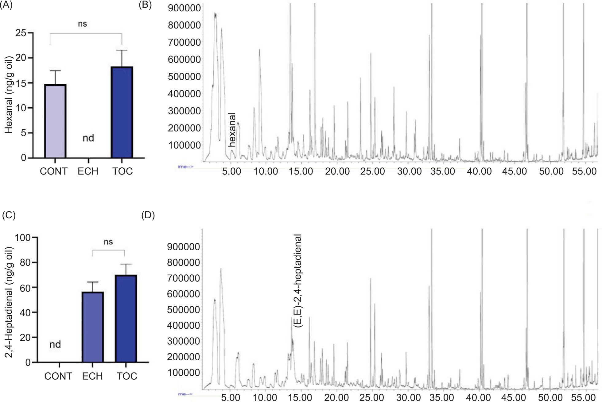 Figure 4. Hexanal and 2,4-heptadienal content of the samples. (A) Hexanal; (B) chromatogram of the TOC sample; (C) (E,E) 2,4 Heptadienal; and (D) Chromatogram of the LOX sample. Bars represent mean ± SD (n=2). Abbreviations: crude echium seeds (CONT), echium seeds after thermal treatment (ECH), echium seeds treated with tocopherol (TOC), nd: not detected.