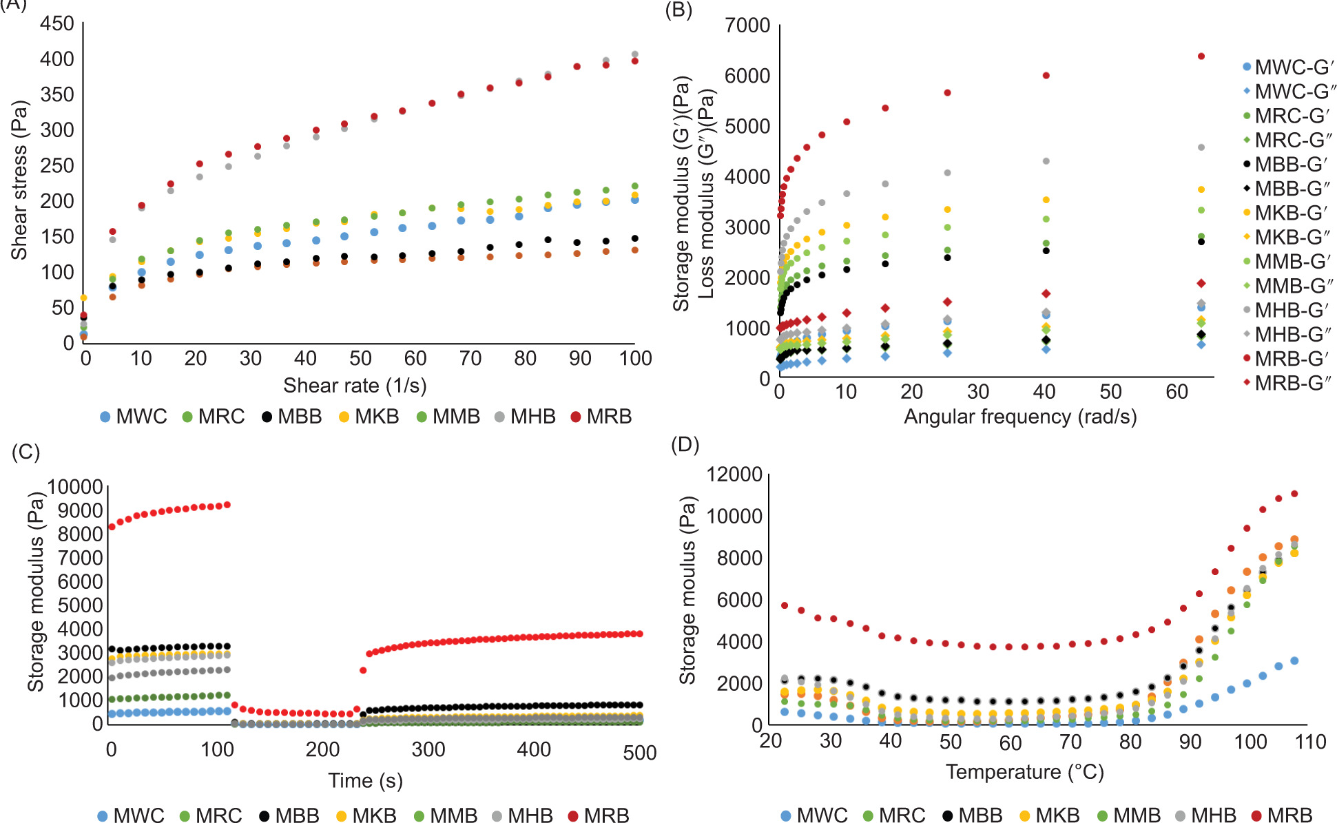 In Eq. 4 and Eq. 5, Gi represents the G' value in the first interval, G0 represents the G' value immediately after exposure to the high shear rate deformation, and G30 represents the G' value 30 s after the high shear rate deformation.