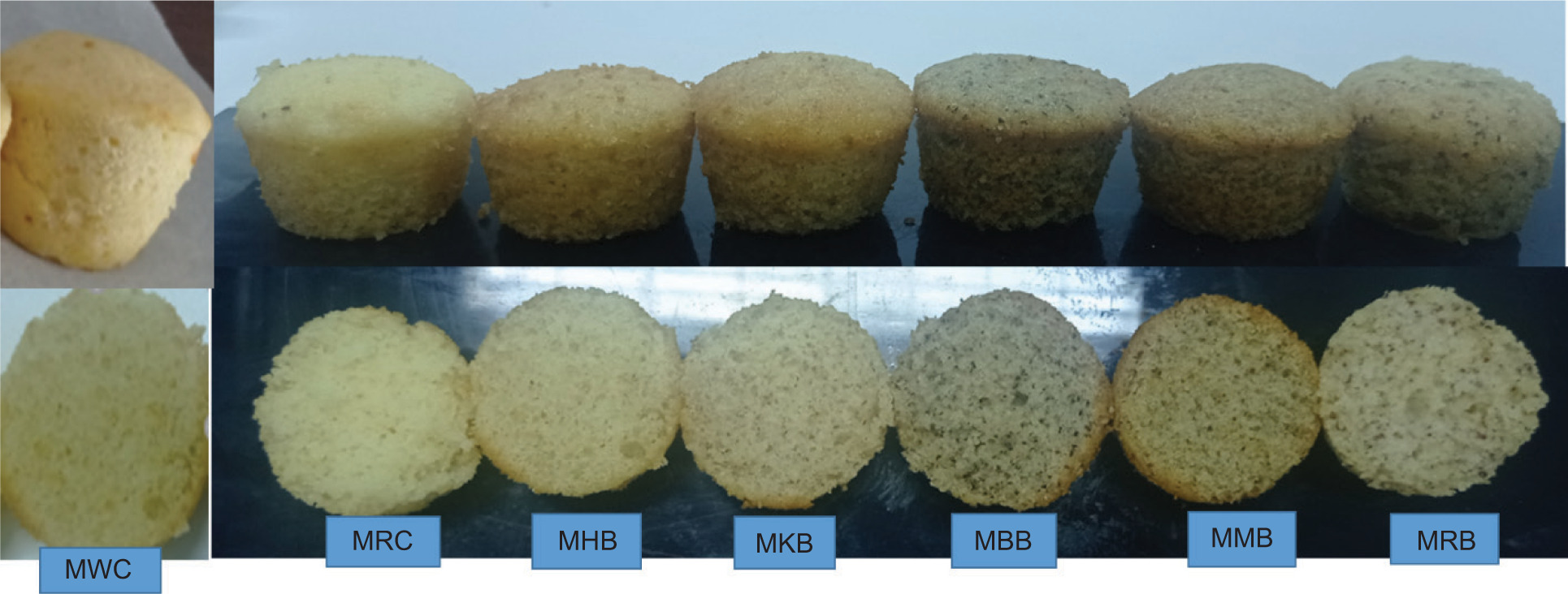 The abbreviations represent the muffins produced with wheat flour (MWC), rice flour (MRC), and fortified with black bean (MBB), kidney bean (MKB), mung bean (MMB), haricot bean (MHB), red bean (MRB) flours. The different lowercase letters in the same column indicate statistical significance (p < 0.05).