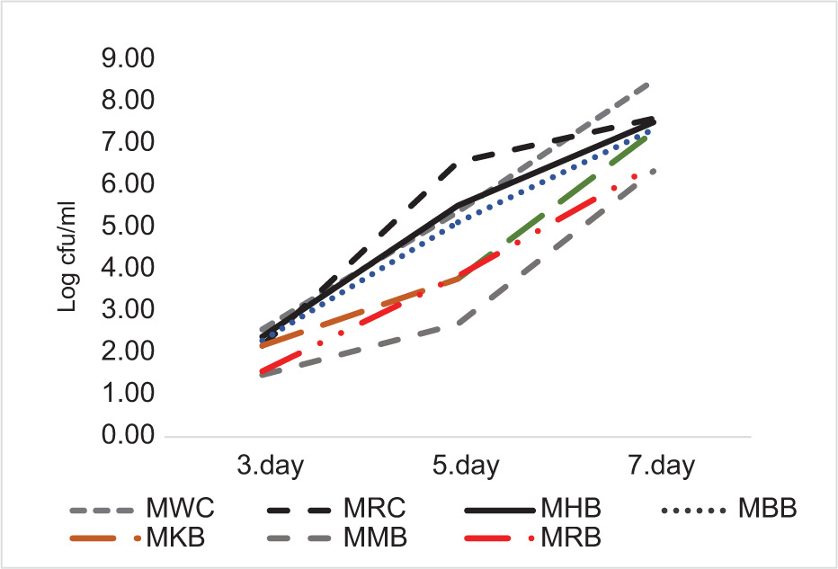The microbial growth in muffin samples during the 7-day storage period is shown in Figure 5. On the first day, the total count varied between 1.48-2.57 log cfu/mL, increasing on the third day to a range of 2.70-6.57 log cfu/mL, and further rising on the seventh day to 6.35-8.52 log cfu/mL. Yeast and mold growth were observed in all muffin samples during the storage period, with the highest increase recorded in the control muffins made with wheat flour (MWC), which reached 8.52 log cfu/mL. In contrast, the muffins made with mung bean flour (MMB) exhibited the lowest increase in microbial growth, with a final count of 6.35 log cfu/mL. Muffins containing germinated legume flour demonstrated lower yeast and mold counts compared to the wheat-based control muffins. This difference is likely attributed to the antimicrobial properties of germinated legume flours. The germination process enhances the presence of bioactive compounds, such as antimicrobial peptides and polyphenolic compounds, which play a key role in inhibiting the growth of bacterial and fungal pathogens. Previous studies have shown that the germination of seeds, such as Lupinus luteus, increases antioxidant activity and polyphenol content, which contribute to the antimicrobial effects (Navarro-Vozmediano et al., 2024). Furthermore, it has been reported that germination of mung bean seeds boosts phenolic compound levels, enhancing their antimicrobial activity (Hafidh et al., 2011). Consequently, the higher phenolic content, increased polyphenols, and protein content in the muffins containing germinated legume flours may explain their better inhibition of mold and yeast growth compared to the wheat control muffins.