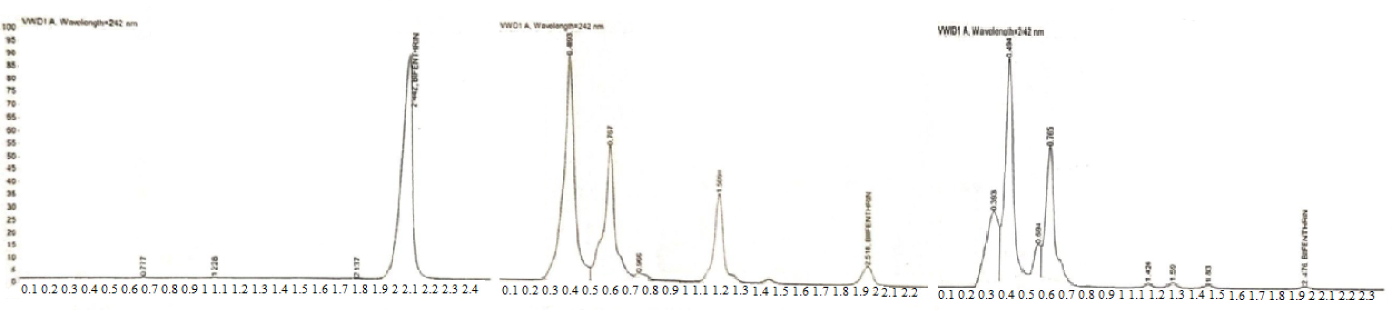 Figure 7. HPLC chromatograms of bifenthrin for lemons. A: Grade standard of bifenthrin; B: Lemons contaminated with bifenthrin before ozonation; C: Lemons contaminated with bifenthrin after ozonation.