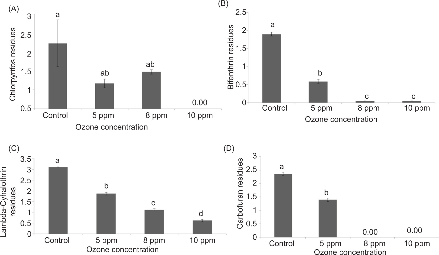 Figure 5. Chlorpyrifos, bifenthrin, carbofuran, and lambda-cyhalothrin residues on lemons treated with different ozone concentrations.