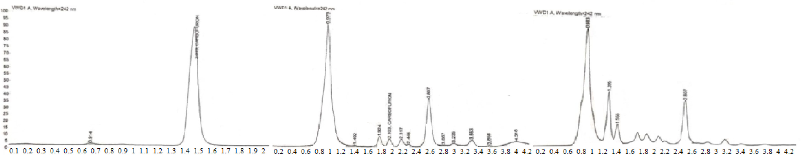 Figure 8. HPLC chromatograms of carbofuran for lemons. A: Grade standard of carbofuran; B: Lemons contaminated with carbofuran before ozonation; C: Lemons contaminated with carbofuran after ozonation.