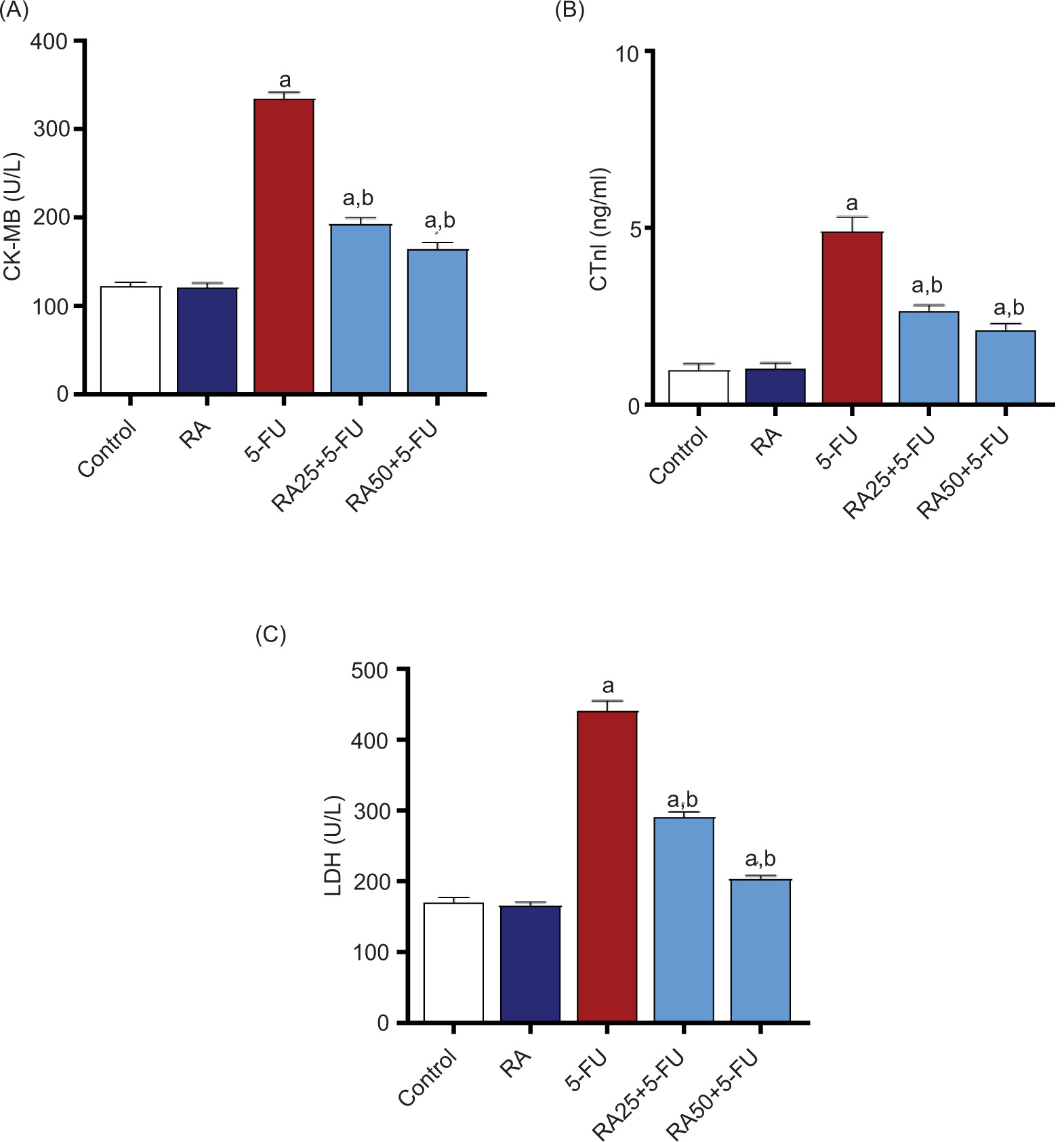 Figure 1. Rosmarinic acid-based prevention of 5-FU-induced myocardial injury. Cardiac injury assessment through serum analysis of (A) CK-MB, (B) cTnI levels, and (C) LDH in RA-treated and untreated mice. Data represent mean ± SEM (n = 6/group). a P < 0.0 vs control, and b P < 0.05 vs 5-FU-injected group.