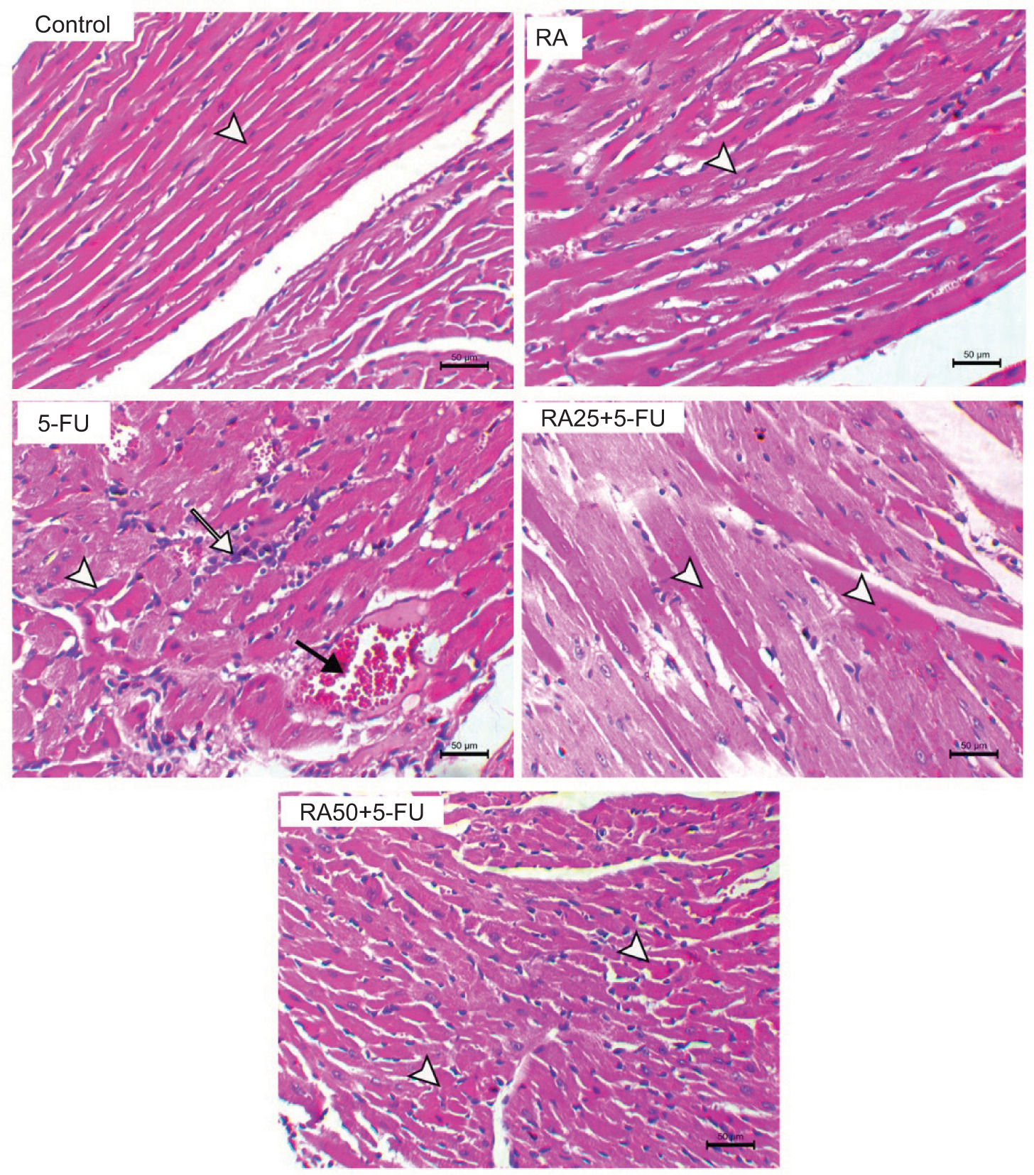 Figure 2. Rosmarinic acid-based prevention of 5-FU-induced histopathological changes in the heart. Representative images show H&E staining of all groups. (Control) H&E-stained cardiac sections from control mice demonstrated normal cardiac muscle fibers with normal sarcoplasm and a normal centrally located nucleus (arrowhead). (RA) H&E-stained cardiac sections from RA-injected mice showing normal cardiac muscle fibers (arrowhead). (5-FU) H&E-stained cardiac sections from 5-FU-injected mice showing myocarditis features associated with congestion of blood capillaries (black arrow), necrosis of the cardiac muscle cells (arrowhead), and infiltration of mononuclear inflammatory cells (white arrow). (RA25+5-FU) H&E-stained cardiac sections from 5-FU-injected mice treated with 25 mg/kg RA showing muscle broad fibers with myolysis and sarcoplasmic degenerative changes (arrowheads). (RA50+5-FU) H&E-stained cardiac sections from 5-FU-injected mice treated with 50 mg/kg RA showing marked improvement and demonstrating mild degree of sarcoplasmic degeneration of the cardiac muscle fibers (arrowheads). H&E; Scale bar = 50 µm.