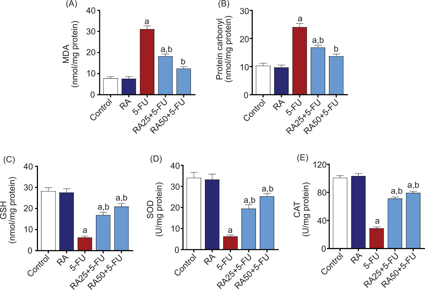 Figure 3. Rosmarinic acid-based attenuation of 5-FU-induced myocardial oxidative stress. RA attenuated (A) MDA and (B) protein carbonyl levels and reduced (C) GSH contents and (D) SOD and (E) CAT activities in the hearts of respective groups. Data represent mean ± SEM (n = 6/group). a P < 0.0 vs control, and b P < 0.05 vs 5-FU-injected group.