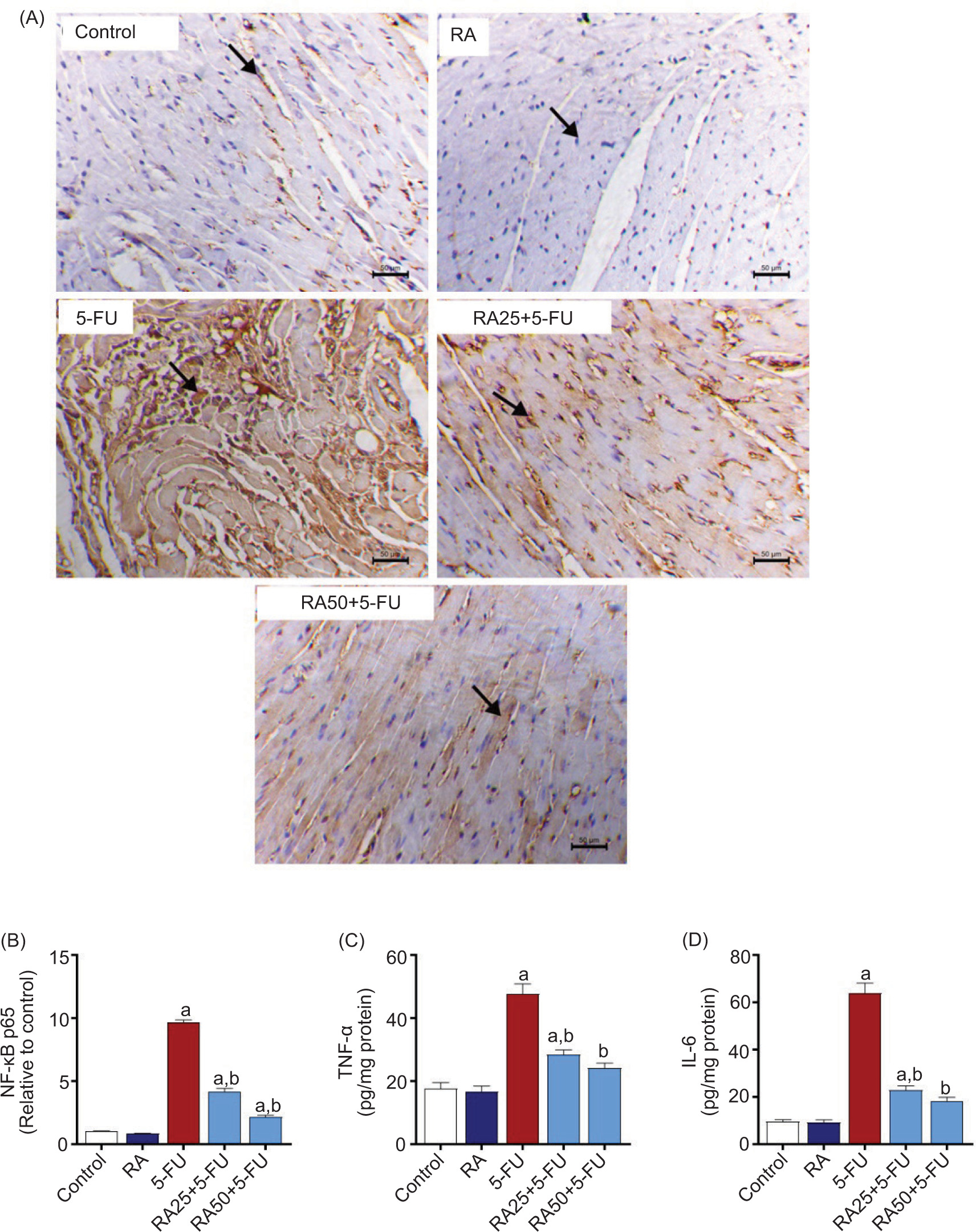Figure 4. Rosmarinic acid-based mitigation of 5-FU-induced increased inflammatory response in mouse heart. (A) Representative photomicrographs represent NF-κB p65 immunostaining within all groups. Brown staining indicates a rise in NF-κB p65 staining intensity whereas arrowheads point towards cardiomyocytes (IHC; 50 µm scale bar). The photomicrograph of 5-FU represents a marked increase of cytoplasmic and nuclear immunoexpression of NFκB P65 antibody within the cardiomyocytes and interstitial inflammatory cells (arrow); while pretreatment of 5-FU-injected mice with RA markedly decreased the expression of NF-κB p65 immunostaining within the cardiomyocytes (arrow). (B) NF-κB p65 immunostaining quantification was calculated relative to the control. RA also significantly decreased cardiac levels of (C) Tumor necrosis factor-alpha (TNF-α) and (D) Interleukin-6 (IL-6) in 5-FU-injected mice. Data represent mean ± SEM (n = 6/group). a P < 0.0 vs control, and b P < 0.05 vs 5-FU-injected group.