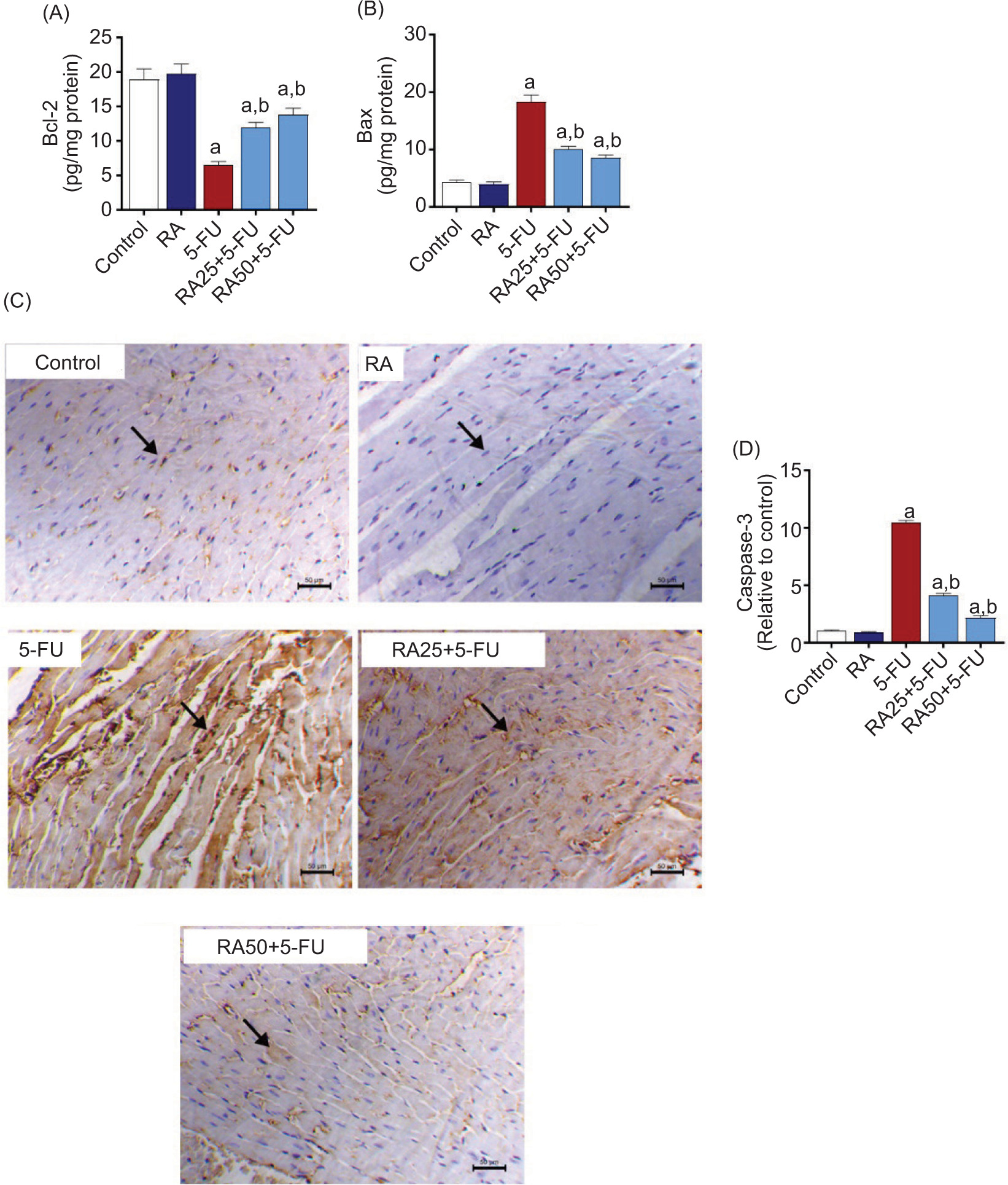 RA protective effects on 5-FU-associated myocardial damage were further evaluated via ELISA-based measurement of apoptosis–regulating proteins (Bcl-2 and Bax) and IHC staining-based caspase-3 examination of the cardiac tissues. 5-FU-injected cardiac tissues demonstrated significantly (P < 0.05) lower Bcl-2 expression (Figure 5A) whereas there was a significant (P < 0.05) rise in Bax (Figure 5B) and caspase-3 expressions (Figure 5C and D) in comparison to the control group. RA pretreatment resulted in significant (P < 0.05) alleviation of cardiac caspase-3, Bax, and Bcl-2 expressions (Figures 5A–5D).