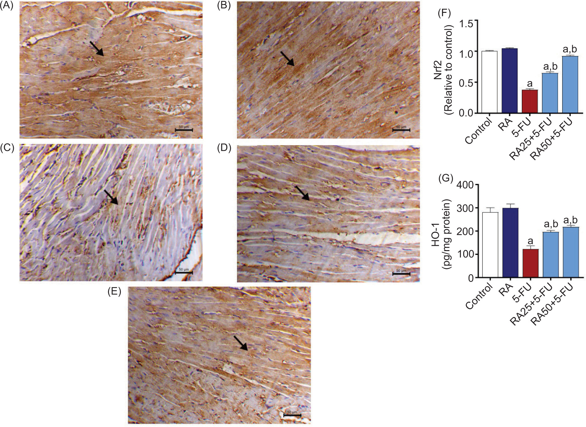Since Nrf2/HO-1 pathway is known to modulate inflammation and oxidative injury in tissues, RA effects on Nrf2 expression and HO-1 contents were also assessed in myocardial tissues. 5-FU-administered mice presented a significant (P < 0.05) reduction in myocardial Nrf2 expression and HO-1 levels than in the control group (Figure 6). RA pretreatment of 5-FU-administered mice restored (P < 0.05) Nrf2 expression and HO-1 levels in cardiac tissues (Figure 6).