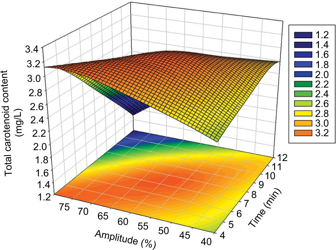 Figure 1. Effect of time and amplitude on total carotenoid content (TCC).