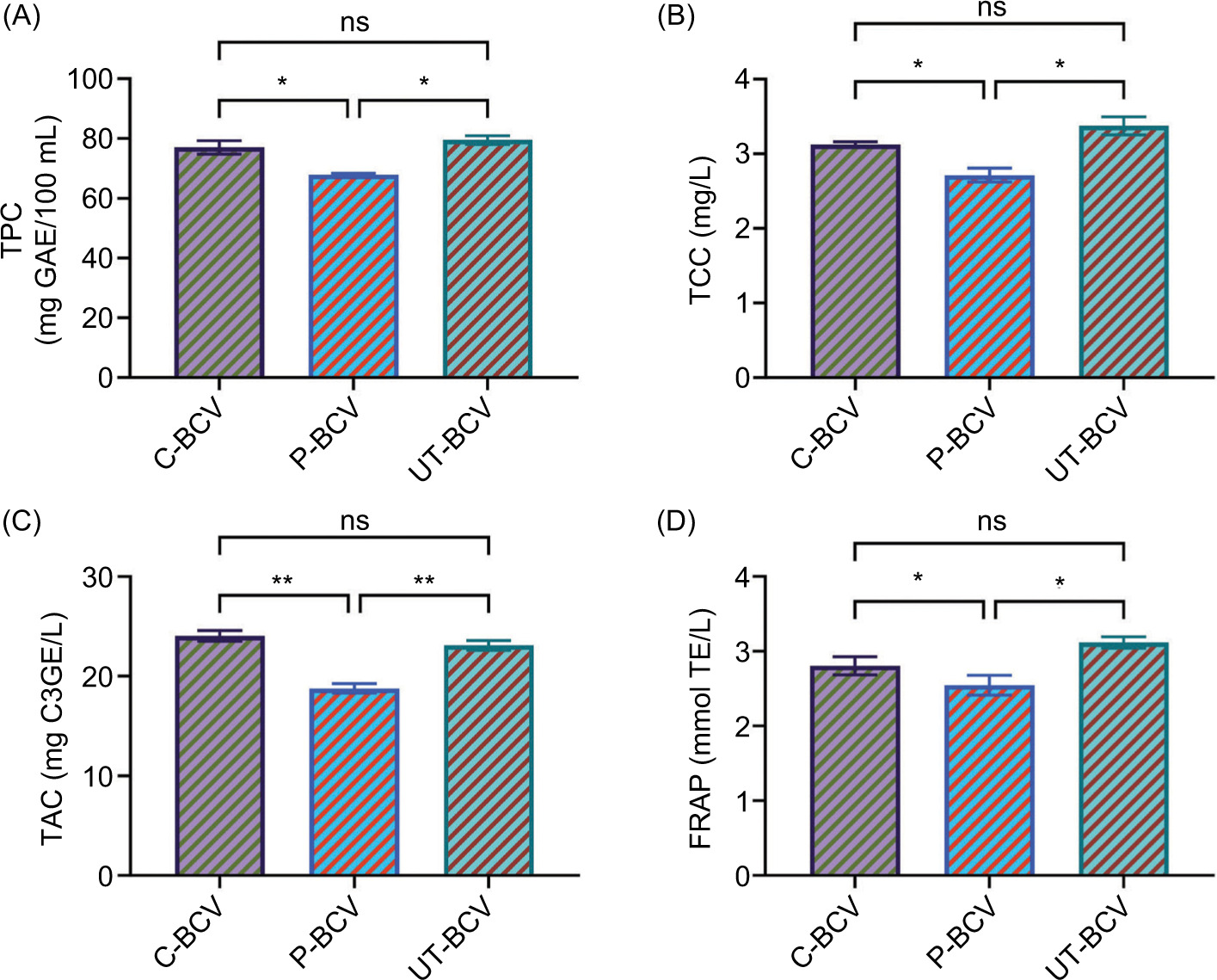 Figure 4. C-BCV (untreated black carrot vinegar), P-BCV (pasteurized black carrot vinegar), and UT-BCV (ultrasound-treated black carrot vinegar) samples were tested for TPC (A), TCC (B), TAC (C), and FRAP (D) values. Letters atop bars indicate statistically significant differences (ns: no significant; *p<0.05; **p<0.01, (n = 3±SD).