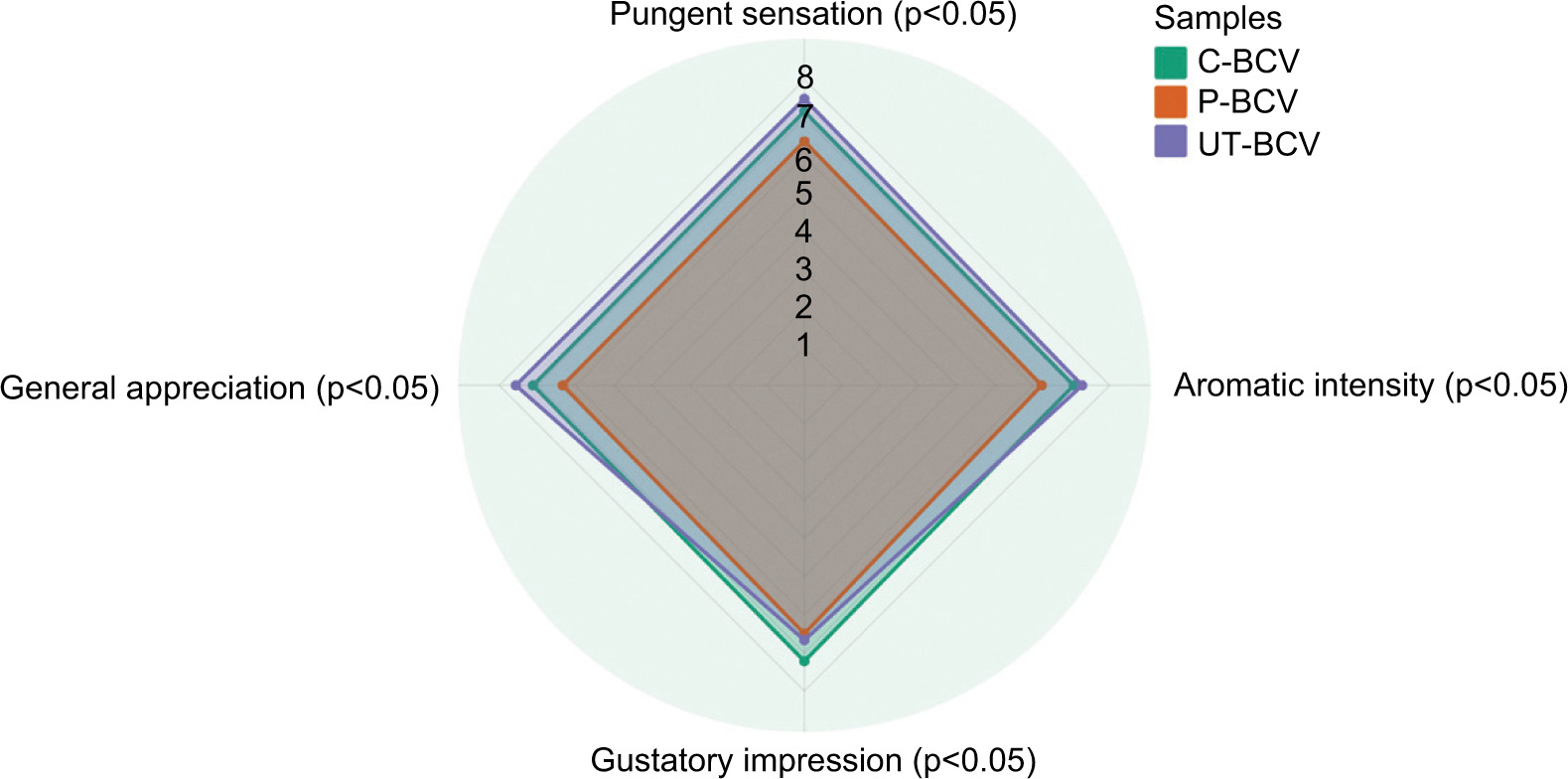 Figure 5. Results of the sensory analysis of the C-BCV, P-BCV, and UT-BCV. C-BCV: Untreated black carrot vinegar; P-BCV: Pasteurized black carrot vinegar; UT-BCV: Ultrasound-treated black carrot vinegar.