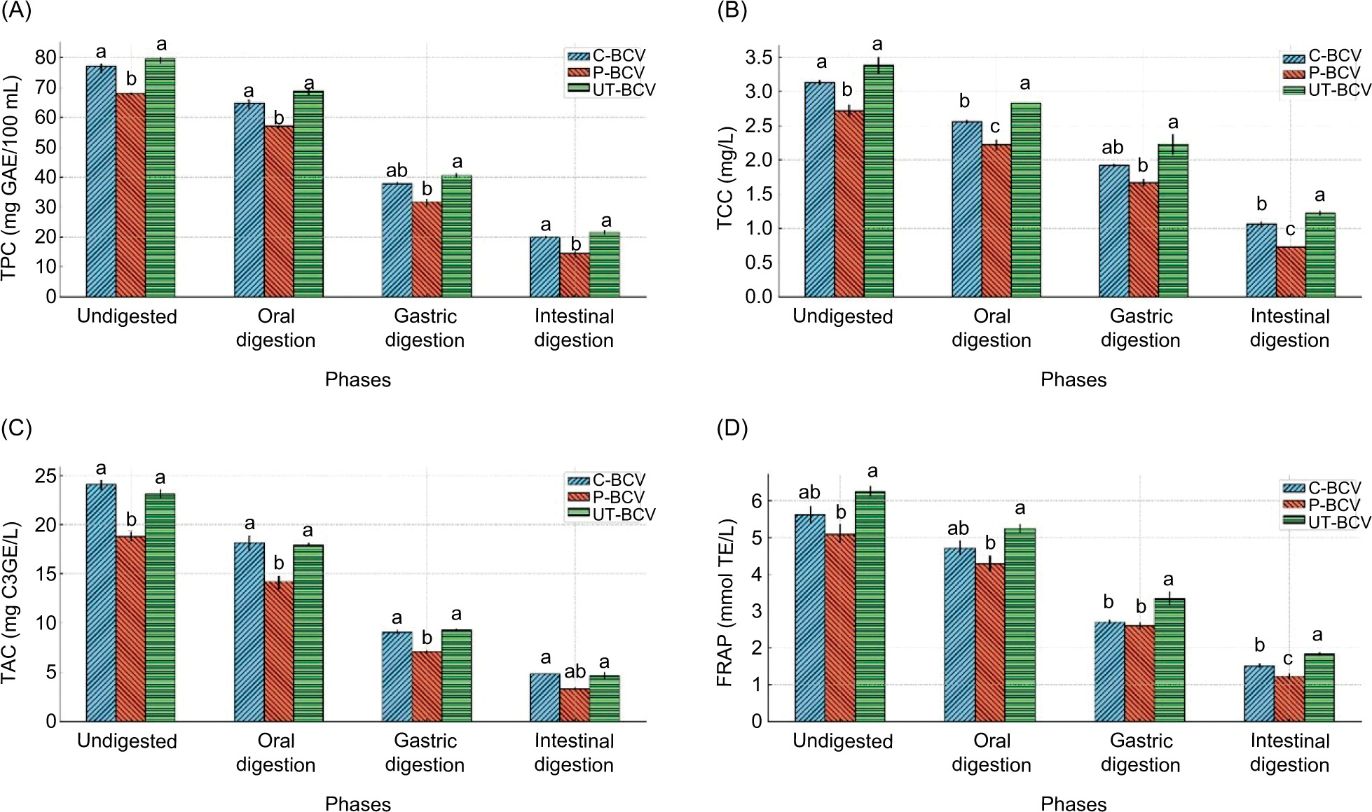 These findings indicate that ultrasound treatment increases the preservation of phenolic compounds, carotenoids, and antioxidants after digestion and provides higher bioavailability. Decreases in the amounts of bioactive components were observed in all groups throughout the digestion stages, but these decreases were significantly less in UT-BCV compared to the other treatments. For example, it has been determined that UT-BCV provides better protection in TPC, TCC, TAC, and FRAP values during intestinal digestion compared to other processes. This reveals that ultrasound treatment is an innovative technology that can optimize bioavailability compared to other processes, especially by increasing the digestion resistance of phenolic compounds. Turker and Dogan (2022) studied anthocyanin extraction techniques from black carrots and offered this technology to protect anthocyanins in food (Aslan Türker and Doğan, 2022).