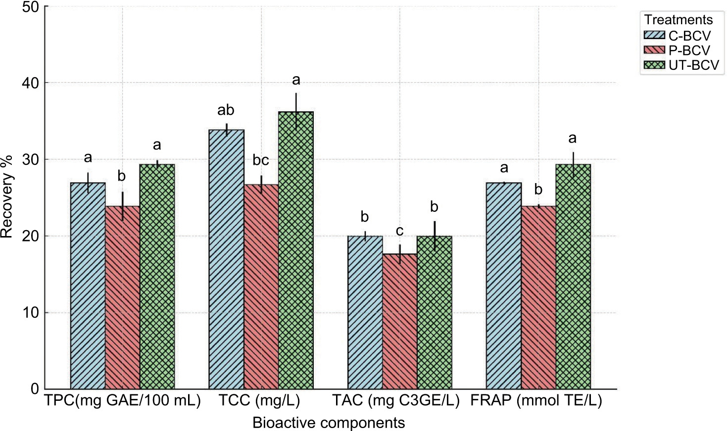 Figure 7. Recovery (%) values of bioactive compounds (TPC, TCC, TAC, and total antioxidant content-FRAP) at the end of the in vitro gastrointestinal digestion.