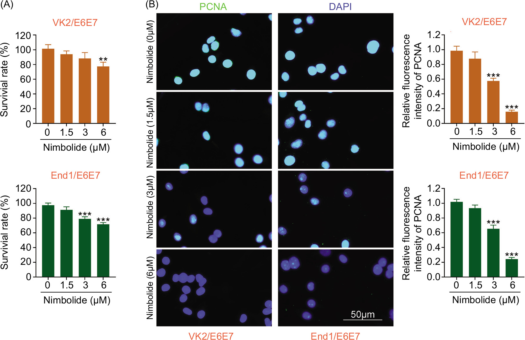 To investigate the effects of nimbolide on endometriosis cell proliferation, VK2/E6E7 and End1/E6E7 cells were treated with 0, 1.5, 3, and 6 μM nimbolide for 24 hours, and cell viability was evaluated using CCK-8 assays. The results showed that nimbolide treatment significantly reduced the OD values of both cell lines in a concentration-dependent manner compared to the control group (Figure 1A). Immunofluorescence staining further revealed a decrease in proliferating cell nuclear antigen (PCNA) expression following exposure to higher concentrations of nimbolide (Figure 1B). Overall, these results indicate that nimbolide inhibits the proliferation of endometriosis cells.