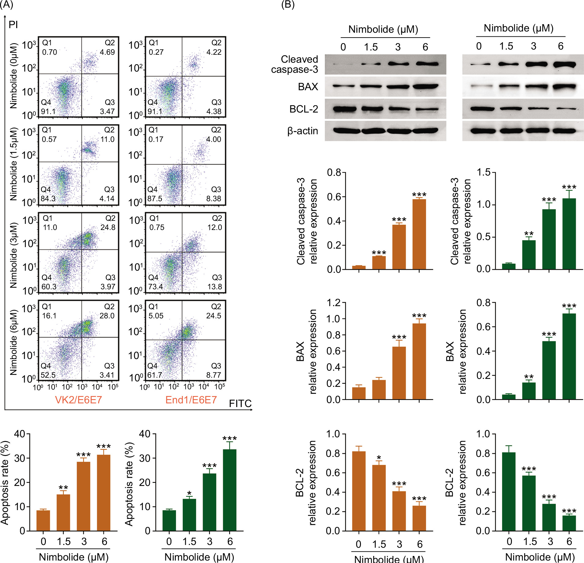 Figure 2 Nimbolide promotes apoptosis in human endometriosis cells. (A) Flow cytometry analysis was performed to determine the effects of nimbolide (0, 1.5, 3, and 6 μM) on apoptosis in VK2/E6E7 and End1/E6E7 cells after 24 hours of treatment. The percentage of apoptotic cells was quantified. (B) Western blot analysis was conducted to examine the expression levels of Bax, Bcl-2, and cleaved caspase-3 in VK2/E6E7 and End1/E6E7 cells following nimbolide treatment. Data are presented as mean ± SD. *p<0.05, **p<0.01, ***p<0.001.