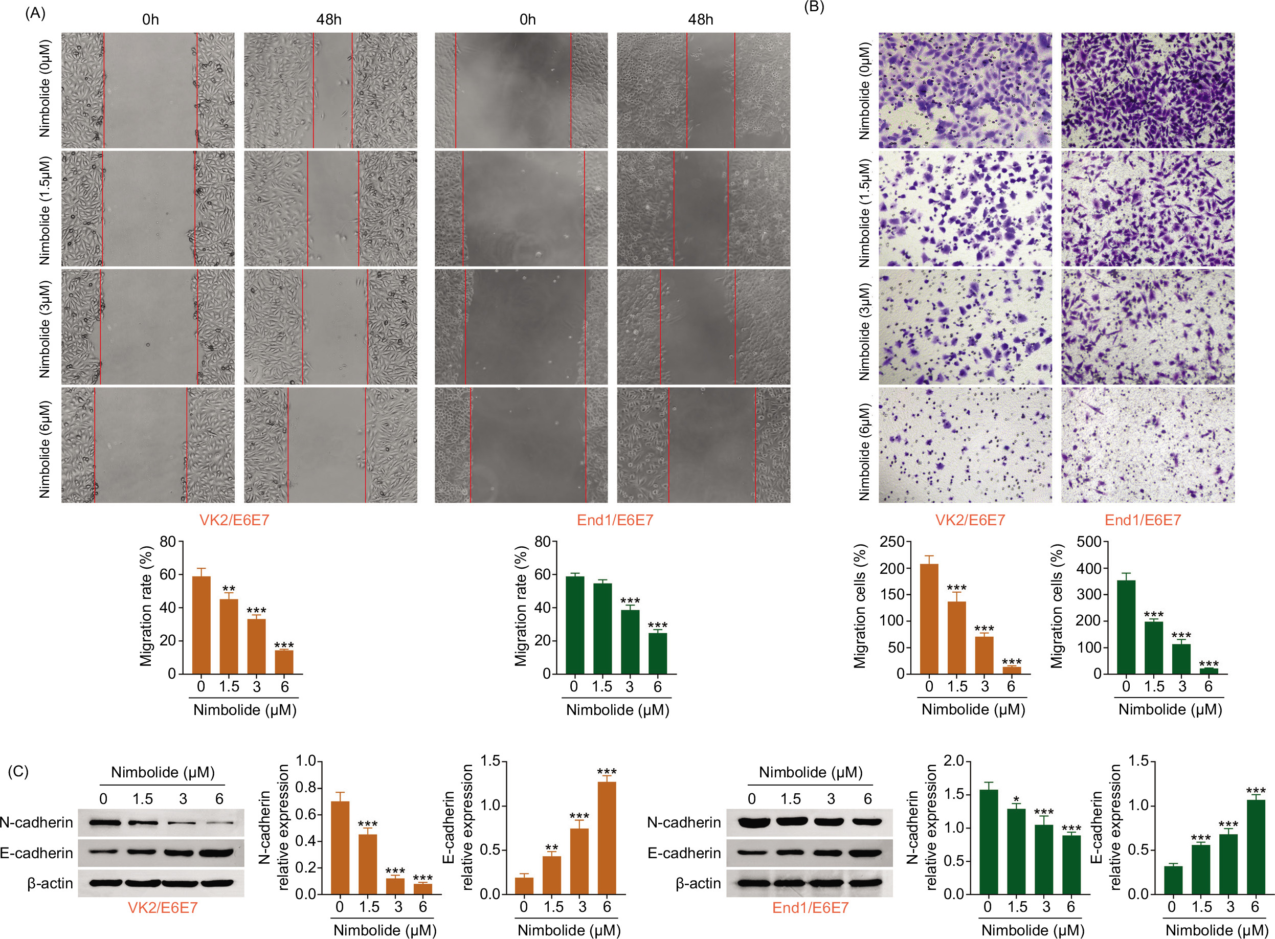 Figure 3 Nimbolide inhibits the migration and invasion of human endometriosis cells. (A) Wound healing assays were performed to evaluate the effects of nimbolide (0, 1.5, 3, and 6 μM) on cell migration in VK2/E6E7 and End1/E6E7 cells after 24 hours of treatment. The migration rate was quantified. (B) Transwell invasion assays were performed to assess the effects of nimbolide (0, 1.5, 3, and 6 μM) on the invasive capacity of VK2/E6E7 and End1/E6E7 cells. The number of invaded cells was counted. (C) Western blot analysis was performed to determinethe expression levels of N-cadherin and E-cadherin in VK2/E6E7 and End1/E6E7 cells following nimbolide treatment. Data are presented as mean ± SD. *p<0.05, **p<0.01, ***p<0.001.