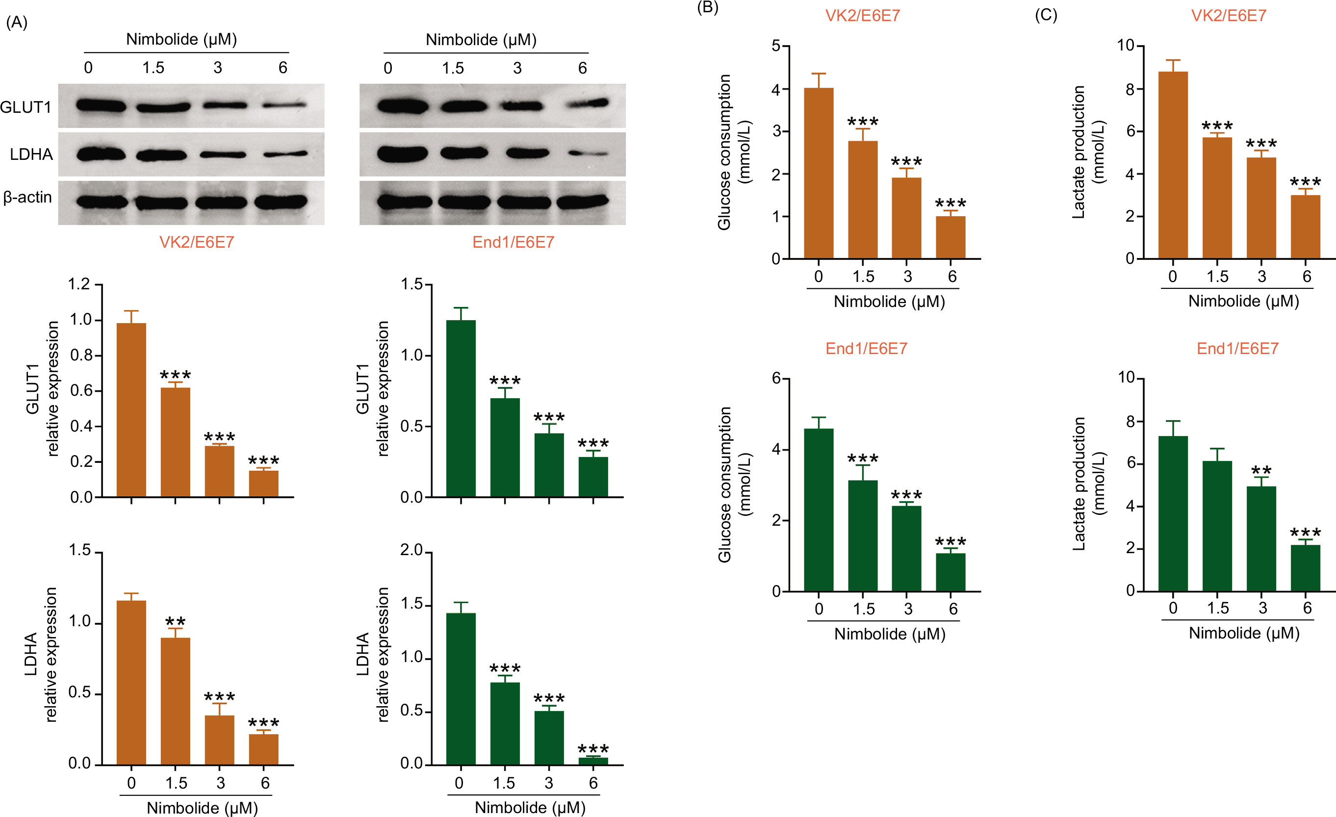 To assess the impact of nimbolide on glycolysis, the expression levels of key glycolytic markers, GLUT1 and LDHA, were analyzed. Western blot results showed that nimbolide treatment reduced the expression of both markers in VK2/E6E7 and End1/E6E7 cells compared to the control group (Figure 4A). Nimbolide also significantly decreased glucose uptake (Figure 4B) and lactate production (Figure 4C), further confirming its inhibitory effects on glycolysis in endometriosis cells.