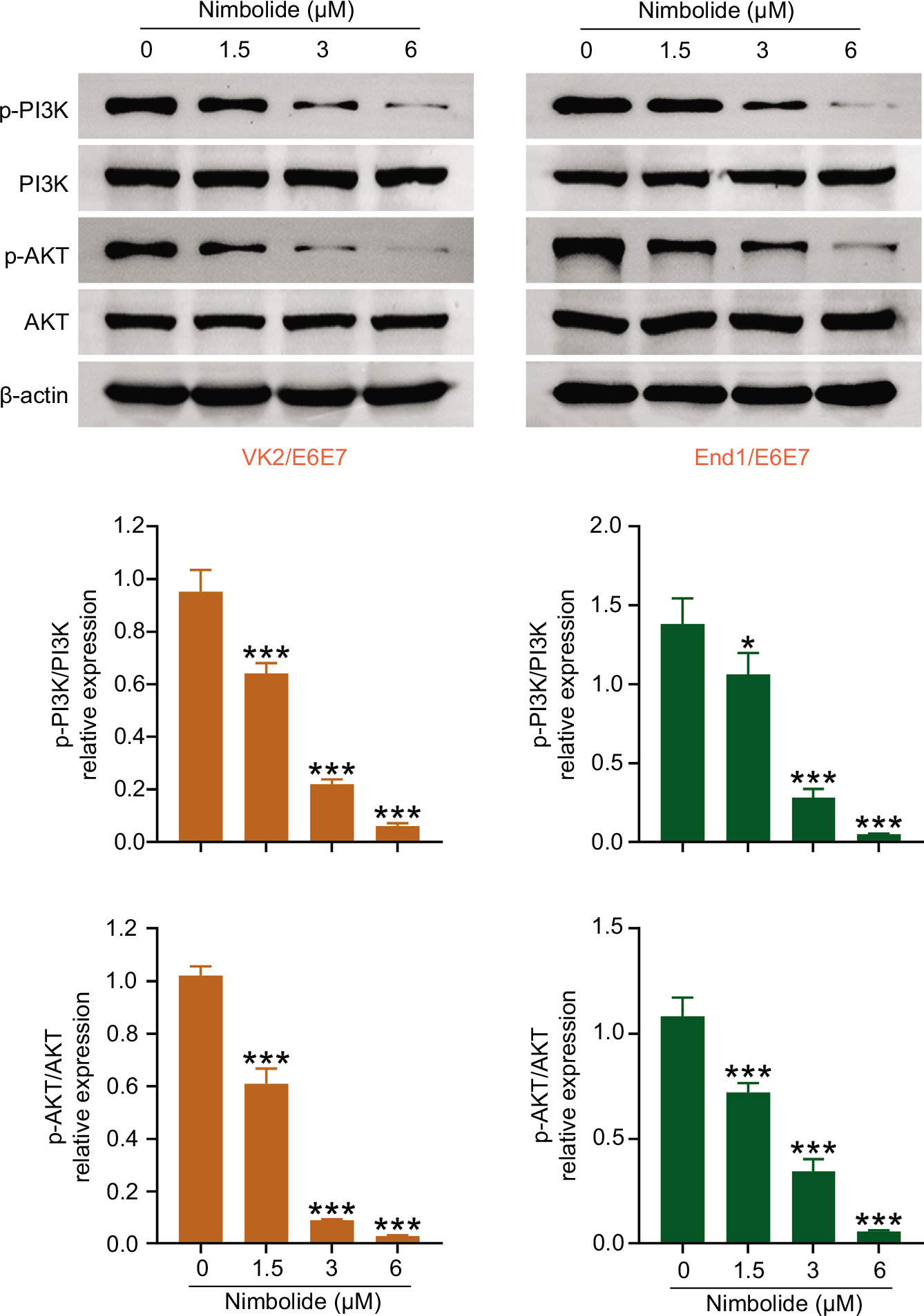 Figure 5 Nimbolide inhibits the PI3K/AKT pathway. Western blot analysis was performed to assess the expression and phosphorylation levels of PI3K and Akt in VK2/E6E7 and End1/E6E7 cells treated with nimbolide (0, 1.5, 3, and 6 μM) for 24 hours. Data are presented as mean ± SD. *p<0.05, ***p<0.001.