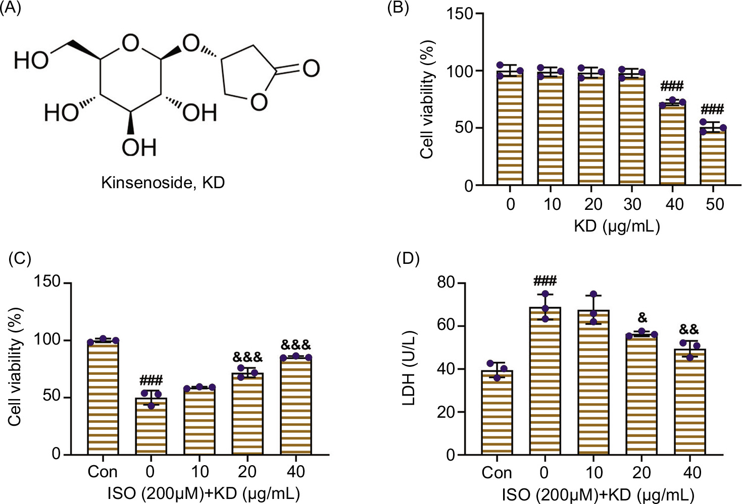 Figure 1 KD enhances viability in ISO-stimulated H9c2 cells. (A) Molecular structure of KD. (B) CCK-8 assay results showing the viability of H9c2 cells treated with KD at concentrations of 10, 20, 40, 80, and 160 μg/mL for 24 h. Optical density (OD) was measured at 450 nm. ###p < 0.001, KD vs. control. (C) CCK-8 assay results demonstrating the viability of H9c2 cells treated with ISO and KD at concentrations of 10, 20, and 40 μg/mL for 24 h. OD450 values were measured. (D) LDH release assay assessing cytotoxicity in H9c2 cells following treatment with ISO and KD at concentrations of 10, 20, and 40 μg/mL for 24 h. ###p < 0.001, ISO vs. control; &p < 0.05, &&&p < 0.001, ISO + KD vs. ISO. KD, Kinsenoside; ISO, Isoproterenol.