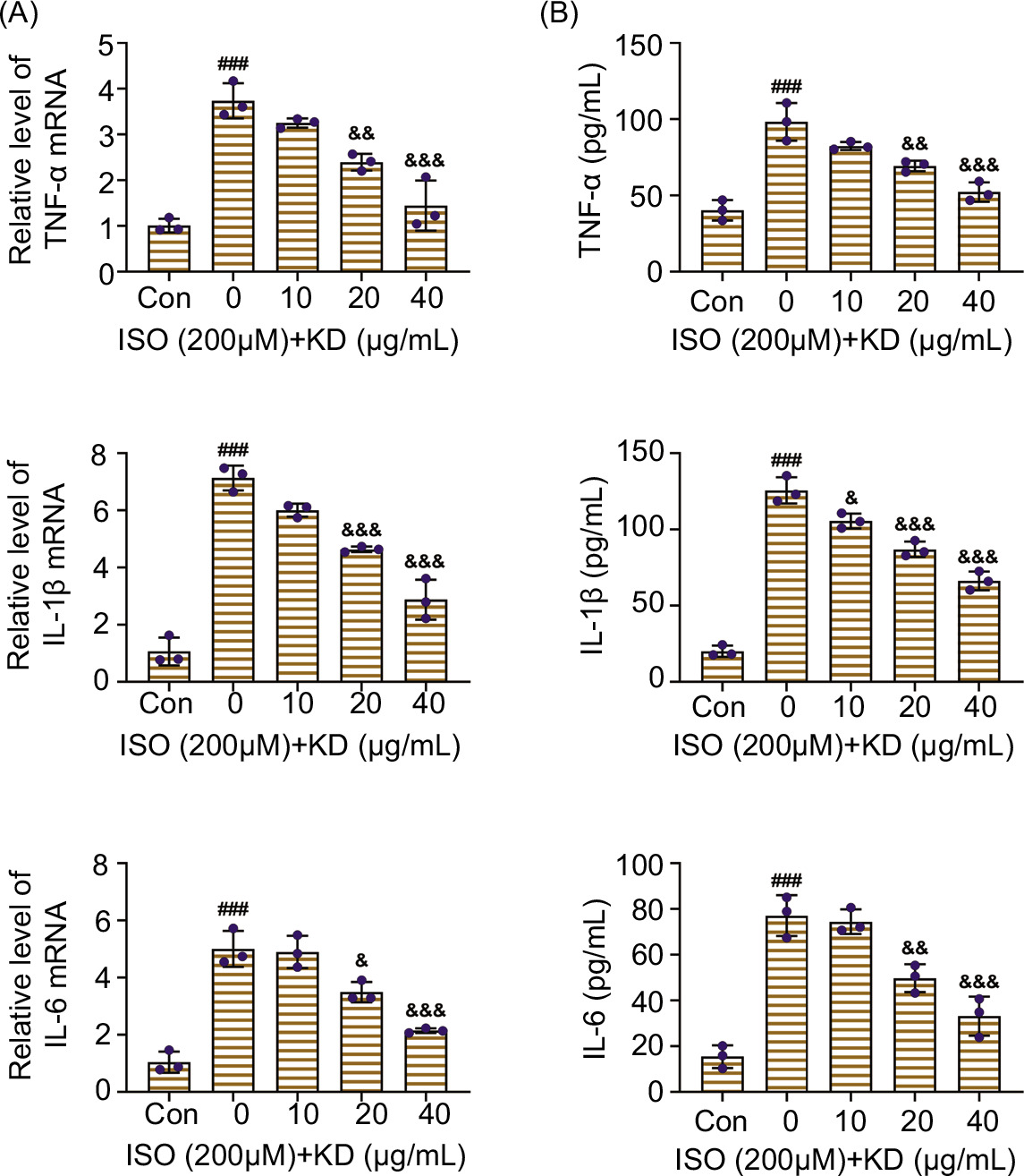 Figure 2 KD suppresses ISO-induced inflammatory cytokine production. (A) qPCR analysis of TNF-α, IL-6, and IL-1β mRNA levels in H9c2 cells treated with ISO and KD at concentrations of 10, 20, and 40 μg/mL for 24 h. (B) ELISA quantification of TNF-α, IL-6, and IL-1β secretion in H9c2 cells treated with ISO and KD at concentrations of 10, 20, and 40 μg/mL for 24 h. ###p < 0.001, ISO vs. control; &p < 0.05, &&p < 0.01, &&&p < 0.001, ISO + KD vs. ISO. KD, Kinsenoside; ISO, Isoproterenol.