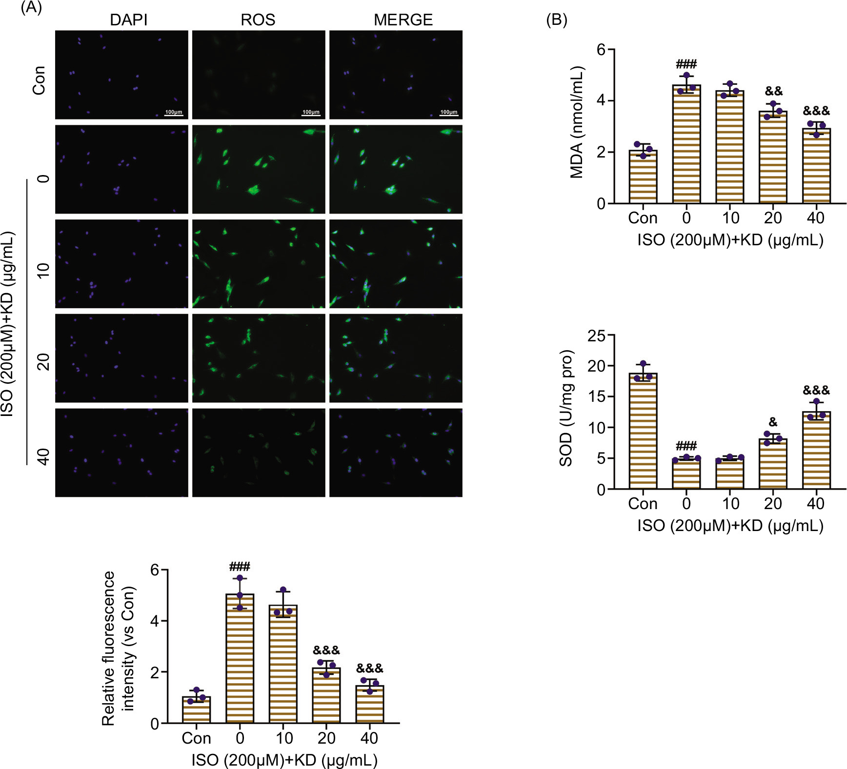 Figure 3 KD reduces ISO-induced oxidative stress. (A) Representative images of ROS staining in H9c2 cells treated with ISO and KD at concentrations of 10, 20, and 40 μg/mL for 24 h. Green fluorescence indicates ROS accumulation. Scale bar, 100 μm. (B) Quantification of MDA (upper panel) and SOD (lower panel) levels in H9c2 cells treated with ISO and KD at concentrations of 10, 20, and 40 μg/mL for 24 h. ###p < 0.001, ISO vs. control; &p < 0.05, &&p < 0.01, &&&p < 0.001, ISO + KD vs. ISO. KD, Kinsenoside; ISO, Isoproterenol.