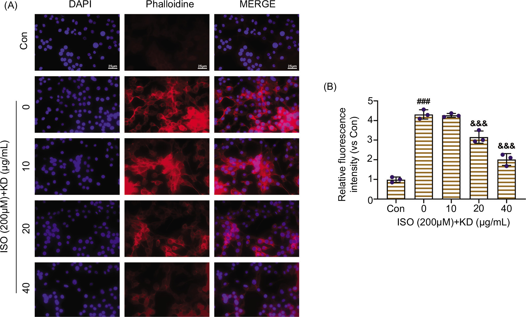 Figure 4 KD mitigates ISO-induced cardiomyocyte hypertrophy. (A) Representative images of phalloidin staining demonstrating the extent of cardiomyocyte hypertrophy in H9c2 cells treated with ISO and KD at concentrations of 10, 20, and 40 μg/mL for 24 h. Red fluorescence indicates actin filaments. Scale bar, 100 μm. (B) Quantification of cardiomyocyte hypertrophy following ISO and KD treatment. ###p < 0.001, ISO vs. control; &p < 0.05, &&p < 0.01, &&&p < 0.001, ISO + KD vs. ISO. KD, Kinsenoside; ISO, Isoproterenol.