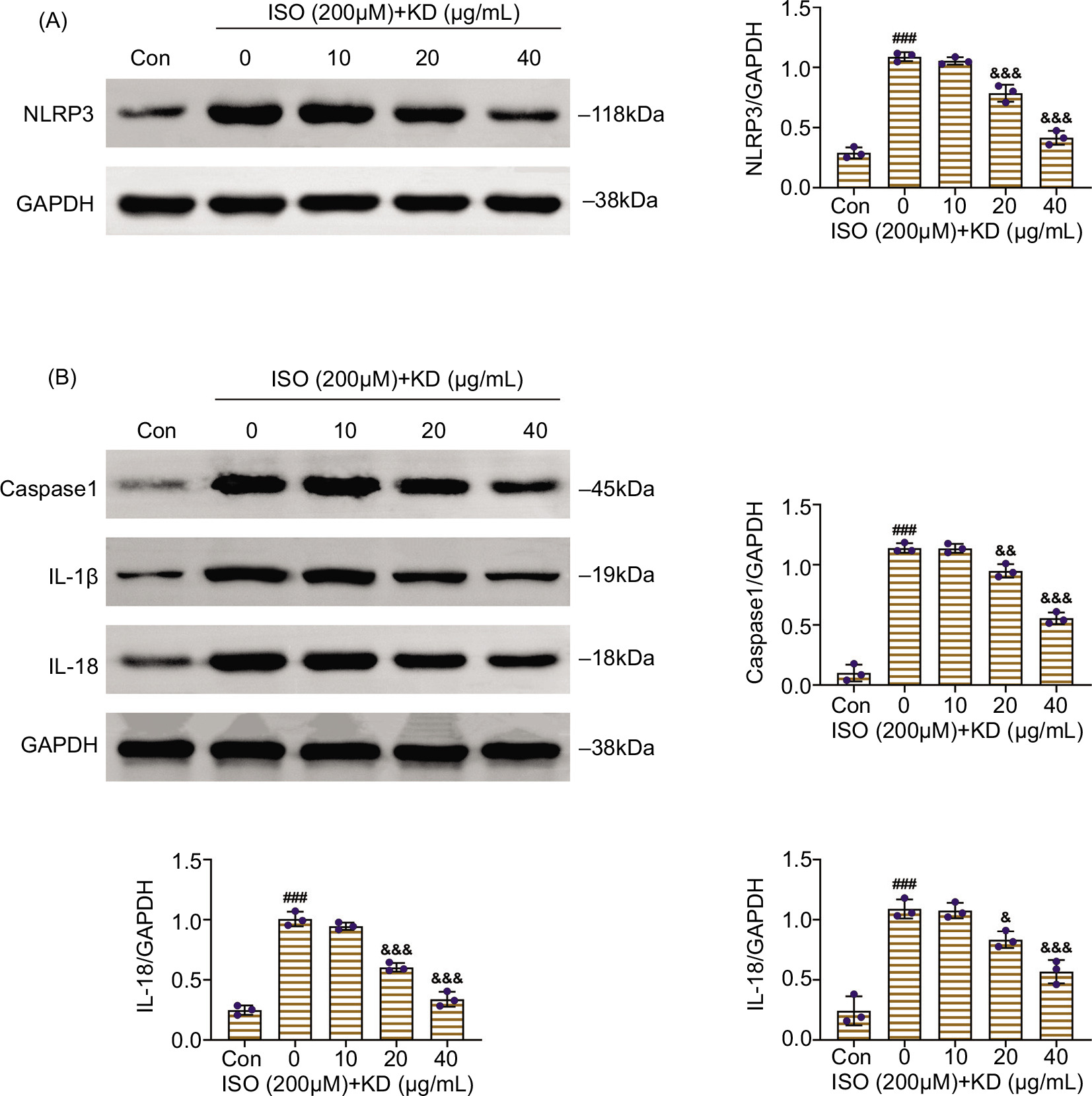 Figure 5 KD inhibits ISO-induced NLRP3 inflammasome activation. (A) Immunoblot analysis of NLRP3 expression in H9c2 cells treated with ISO and KD at concentrations of 10, 20, and 40 μg/mL for 24 h. Relative expression levels of NLRP3 were quantified. (B) Immunoblot analysis of caspase-1, IL-1β, and IL-18 expression in H9c2 cells treated with ISO and KD at concentrations of 10, 20, and 40 μg/mL for 24 h. Relative protein expression levels were quantified. ###p < 0.001, ISO vs. control; &p < 0.05, &&p < 0.01, &&&p < 0.001, ISO + KD vs. ISO. KD, Kinsenoside; ISO, Isoproterenol.
