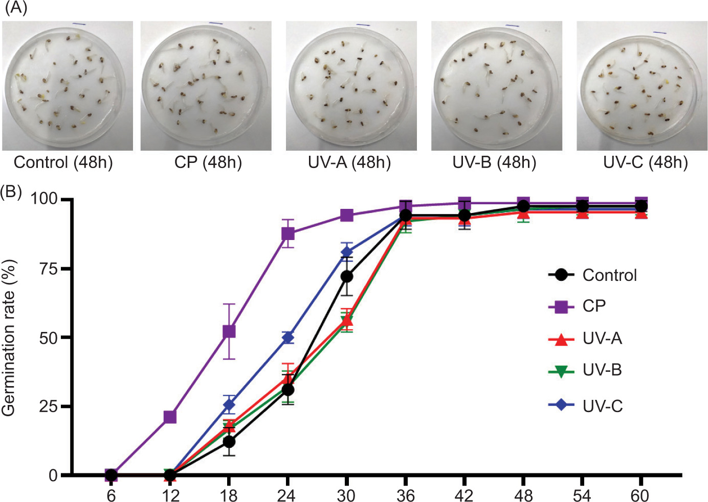 Figure 1. Germination kinetics of alfalfa seeds under different treatments and phenotypic comparison. (A) Germination kinetics of alfalfa seeds over a 60-hour period, comparing the effects of cold plasma (CP) and UV radiation (UV-A, UV-B, and UV-C) treatments with the control group. (B) Seed germination phenotypes at 48 hours after sowing for control, CP, UV-A, UV-B, and UV-C treated seeds. Each horizontal line indicates a 1 cm scale.
