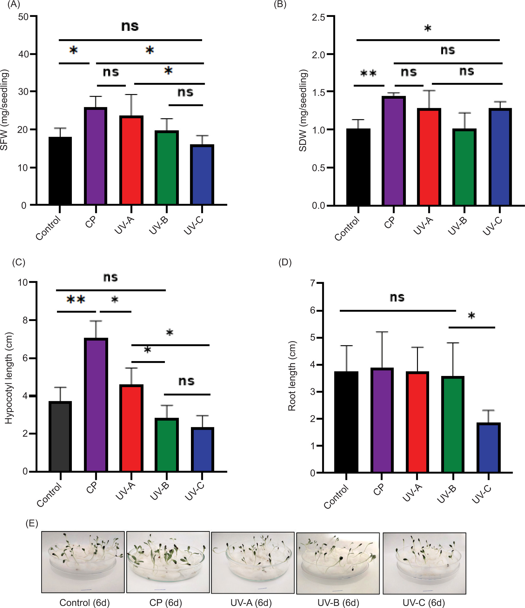 Figure 3. Variation of sprout fresh weight (A), sprout dry weight (B), hypocotyl length (C), and root length (D) after 6 days from sowing variation according to treatments. Sprouts phenotypes after 6 days from sowing for each treatment (E). C: control; CP: cold plasma; UV: Ultraviolet radiations A, B, and C. The horizontal line indicates the 1 cm scale. Asterisks indicate significant difference between seeds treatments (*: P ≤ 0.05; **: P ≤ 0.01; ****: P ≤ 0.001) according to the Duncan’s test.