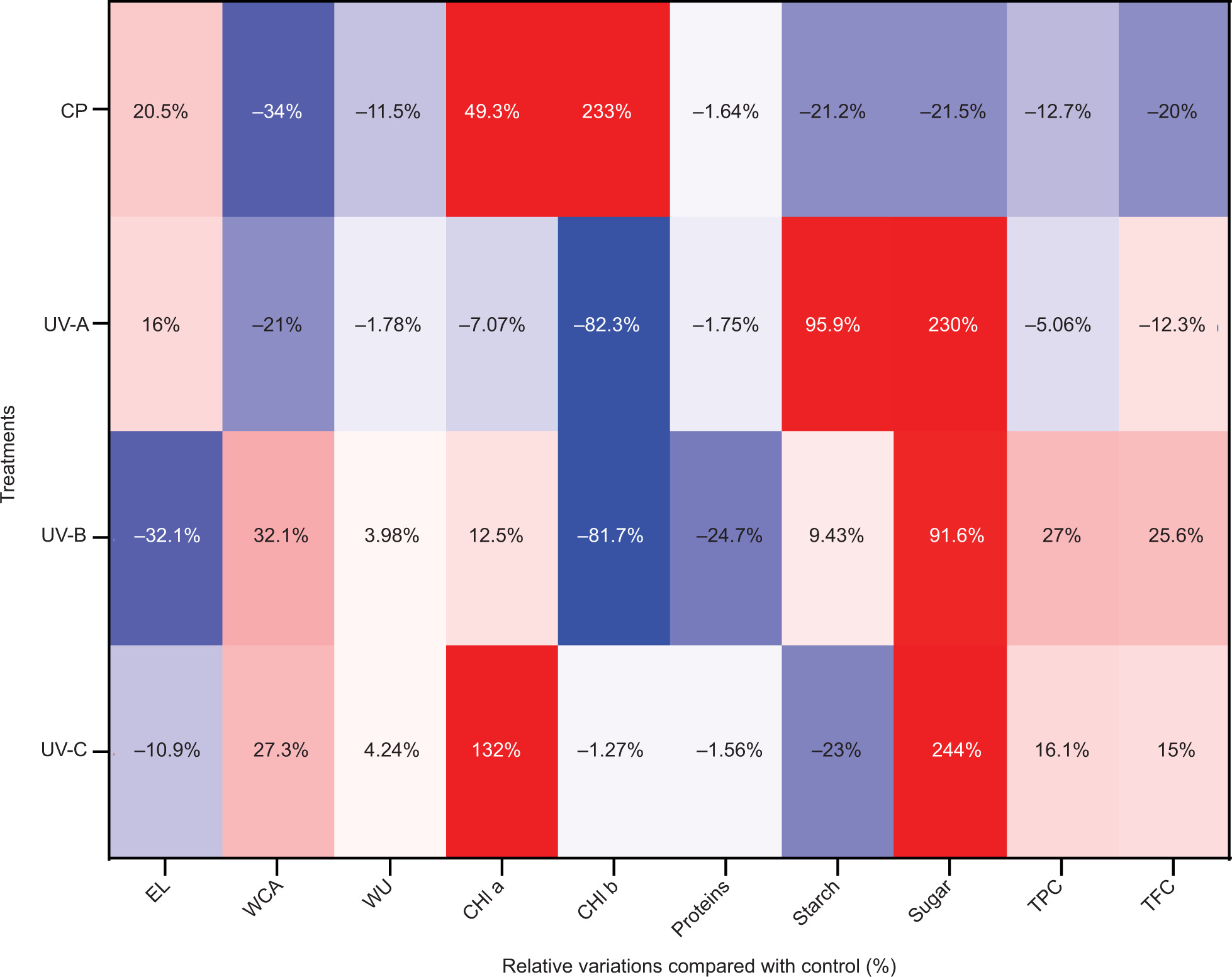 Figure 5. Heatmap summarizing relative changes in physiological and biochemical traits of alfalfa sprouts treated with cold plasma and UV radiation compared to control.