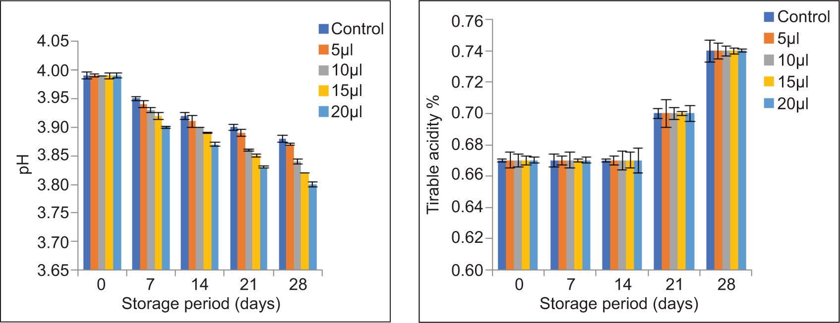Our findings were in agreement with the research conducted by Charfi et al. (2019), who reported a significant enhancement in sugar contents of pomegranate juice treated with Thymbra capitata EO. Similarly, Madhumita et al. (2021) observed an enhancement in the TSS of sapota juice treated with cured betel leaf EO during storage. This rise in TSS was probably linked to fruit ripening process, where organic acids served as crucial respiratory substrates during postharvest storage.
