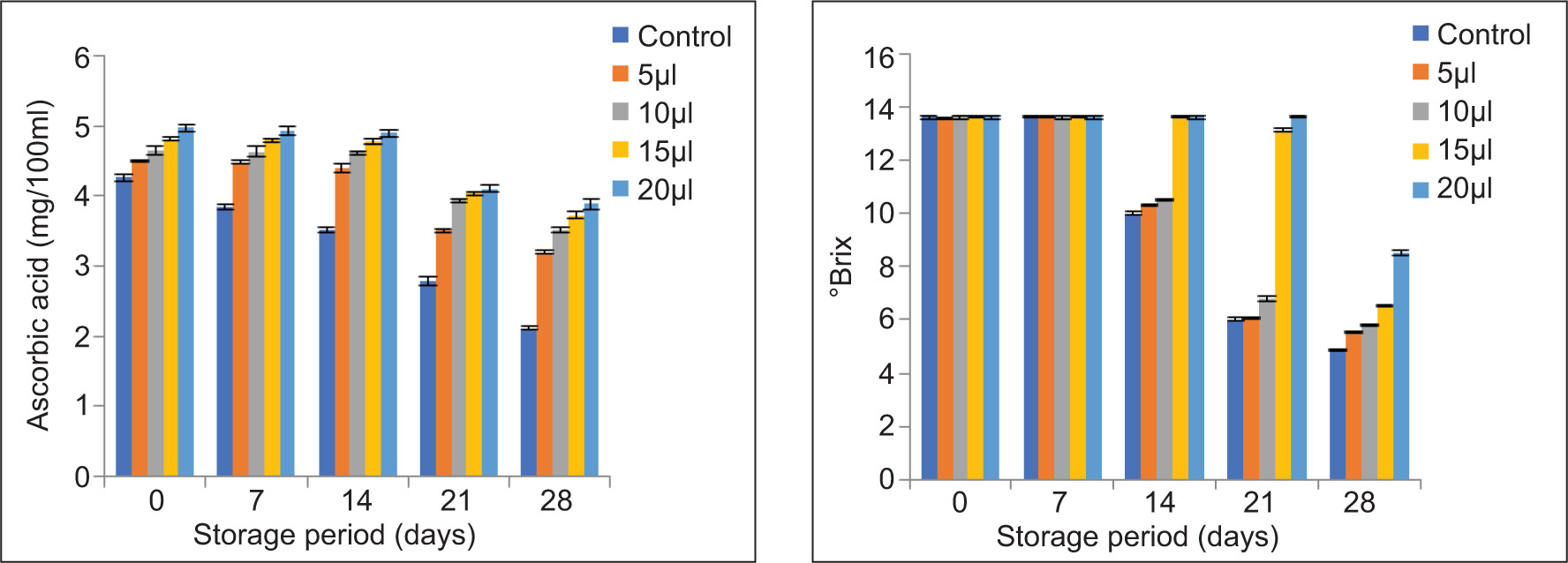 Our results were consistent with a research conducted by Kapoor et al. (2011), who reported a significant enhancement in ascorbic acid of sweet orange juice treated with cardamom EO during storage. Similar findings were noted in case of fresh orange juice preserved with Cymbopogon citrate EO (Adjou et al., 2017). Our findings aligned with the results of a research conducted by Madhumita et al. (2021), who reported that cured betel leaf EO significantly improved the ascorbic acid content in sapota fruit juice.