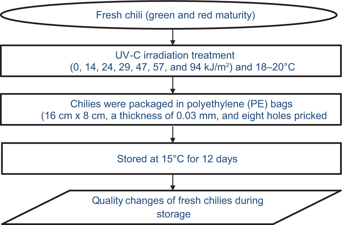 After UV-C irradiation treatment, 50 g of chilies were placed in polyethylene (PE) bags measuring 16 × 8 cm with a thickness of 0.03 mm. Each bag had eight holes pricked for ventilation. The chilies were then stored at 15°C for 12 days. Chili samples were analyzed on Days 0, 3, 6, 9, and 12 for both destructive and nondestructive analyses. An overview of the study procedure is briefly outlined in Figure 2.