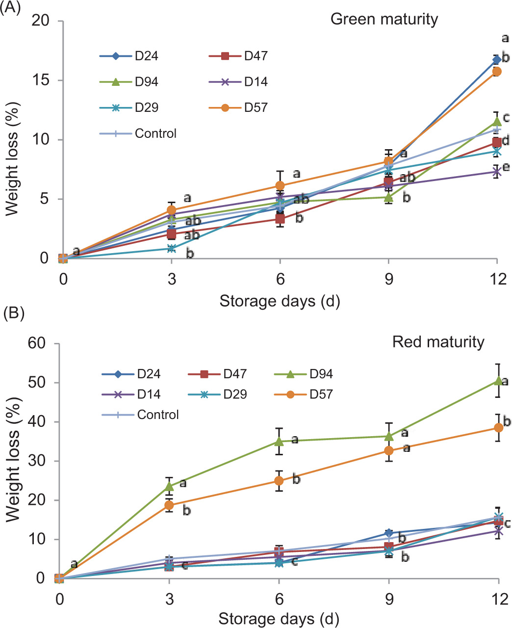 Figure 3. Effect of UV-C light treatments with different concentrations on weight loss of (A) green chili; and (B) red chili during storage. Different letters on the same day indicate the significant difference by Duncan multiple range test (P < 0.05).