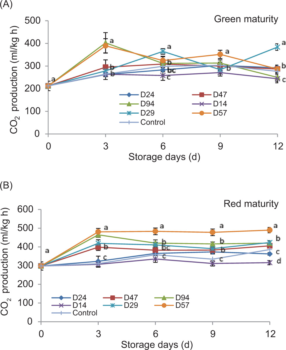 Figure 4. Effect of UV-C light treatments with different concentrations on CO2 production of (A) green chili; and (B) red chili during storage. Different letters on the same day indicate the significant difference by Duncan multiple range test (P < 0.05).