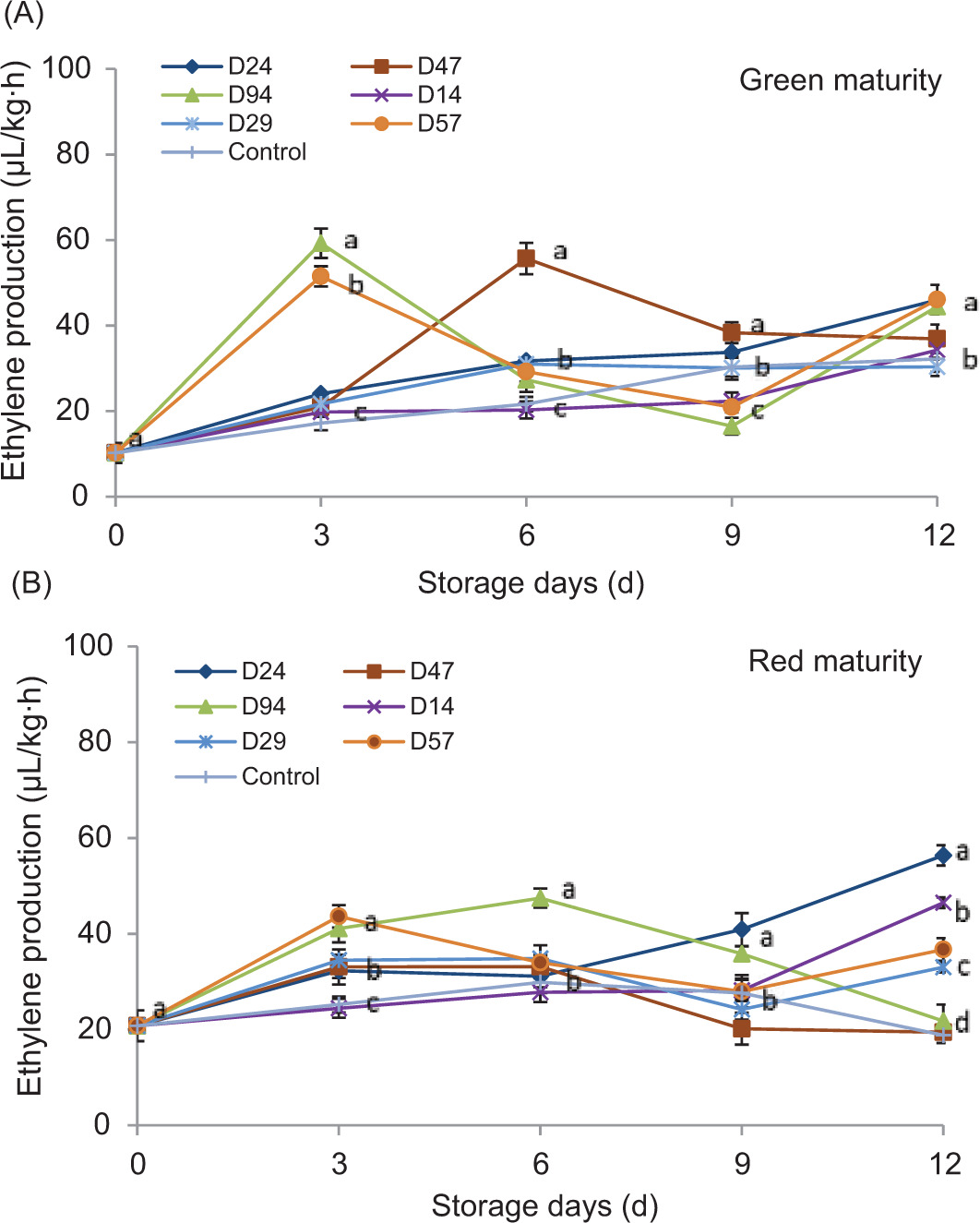 Figure 5. Effect of UV-C light treatments with different concentrations on ethylene production of (A) green chili; and (B) red chili during storage. Different letters on the same day indicate the significant difference by Duncan multiple range test (P < 0.05).
