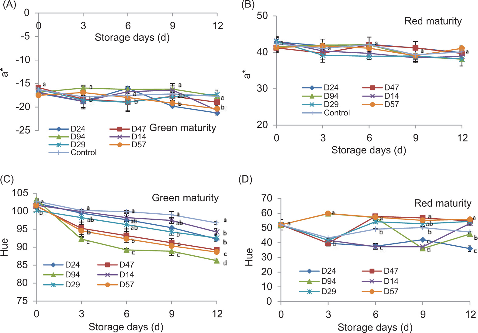 Figure 7. Effect of UV-C light treatments with different concentrations on a* of (A) green chili, and (B) red chili, and hue of (C) green chili, and (D) red chili during storage. Different letters on the same day indicate the significant difference by Duncan multiple range test (P < 0.05).