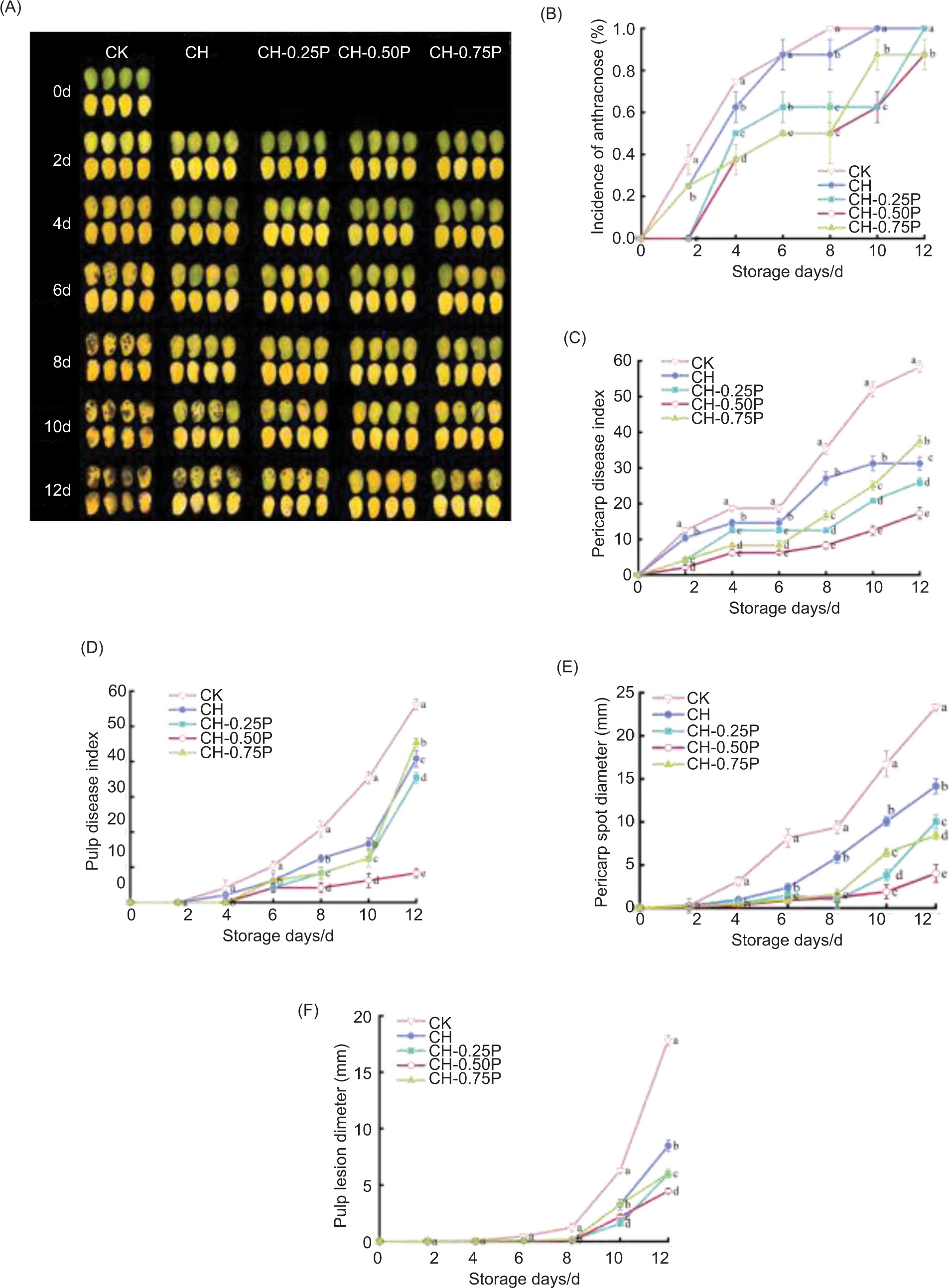 Figure 1. Effects of different concentrations of antimicrobial peptides on the incidence of anthracnose, skin disease index, pulp disease index, skin spot diameter, and pulp spot diameter of mango during storage. In the figure, different lower case letters indicate significant differences (P < 0.05). (A) Apparent phenomenon of storage for 12 days; (B) Incidence of anthracnose; (C) Pericarp disease index; (D) Pulp disease index; (E) Pericarp spot diameter; (F) Pulp lesion diameter/mm.